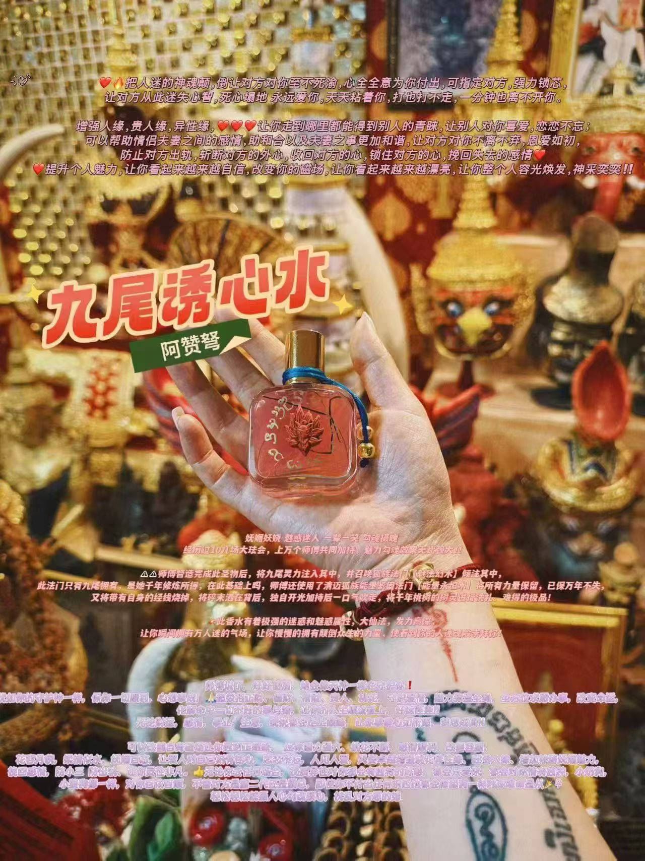 九尾誘心水 阿贊弩 嫵媚妖嬈 魅惑迷人 一顰一笑 勾魂攝魄 經歷過10幾場大琺會,上萬個師傅共同加持,魅力勾魂效果無比強大‼ ⚠師傅督造完成此聖物後,將九尾靈力注入其中,並召喚狐族法門【魅法幻術】傾注其中,此法門只有九尾擁有,是她千年修煉所得,在此基礎上嗎,師傅還使用了清邁狐族能量緊固法門【能量永恆術】將所有力量保留,已保萬年不失,又將帶有自身的經線燒掉,將碎末灑在背後,獨自開光加持後一口氣吹走,將千年桃樹的樹靈進行洗禮。難得的極品! 💥此香水有着極強的迷惑和魅惑屬性,大仙法,發力高深,讓你瞬間擁有萬人迷的氣場,讓你慢慢的擁有顛倒衆生的力量,使看到你的人迷魂般崇拜你! 可以改善自身磁場讓你遇到正姻緣、 讓你魅力強大、桃花不斷、感情順利、改善容顏,花容月貌,柔情似水,嫵媚百態,讓愛人對自己刻骨銘心,戀戀不忘,人見人愛,風姿卓越增強桃花異性緣、旺貴人緣、增加神祕嫵媚魅力,挽回感情,防小三 防出軌、讓你靈性非凡。👍無論你去任何場合,優質異性對你都會有獨特的好感,都會只愛你,都會對你情有獨鍾,小奶狗,小狼狗都一樣,對你百依百順,不管對方是富二代還是霸總,即使你不付出任何東西他都會像舔狗一樣對你唯命是從🎉♀輕鬆輕鬆就攝人心勾魂鎖心,擾亂對方思的緒. ❤🔥把人迷的神魂顛,倒讓對方對你至不死渝,心全全意爲你付出,可指定對方,強力鎖芯,讓對方從此迷失心智,死心塌地 永遠愛你,天天粘着你,打也打不走,一分鐘也離不開你。 增強人緣,貴人緣,異性緣,❤❤❤讓你走到哪裡都能得到別人的青睞,讓別人對你喜愛,戀戀不忘;可以幫助情侶夫妻之間的感情,助和合以及夫妻之事更加和諧,讓對方對你不離不棄,恩愛如初,防止對方出軌,斬斷對方的外心,收回對方的心,鎖住對方的心,挽回失去的感情❤ ❤提升個人魅力,讓你看起來越來越自信,改變你的磁場,讓你看起來越來越漂亮,讓你整個人容光煥發,神采奕奕‼