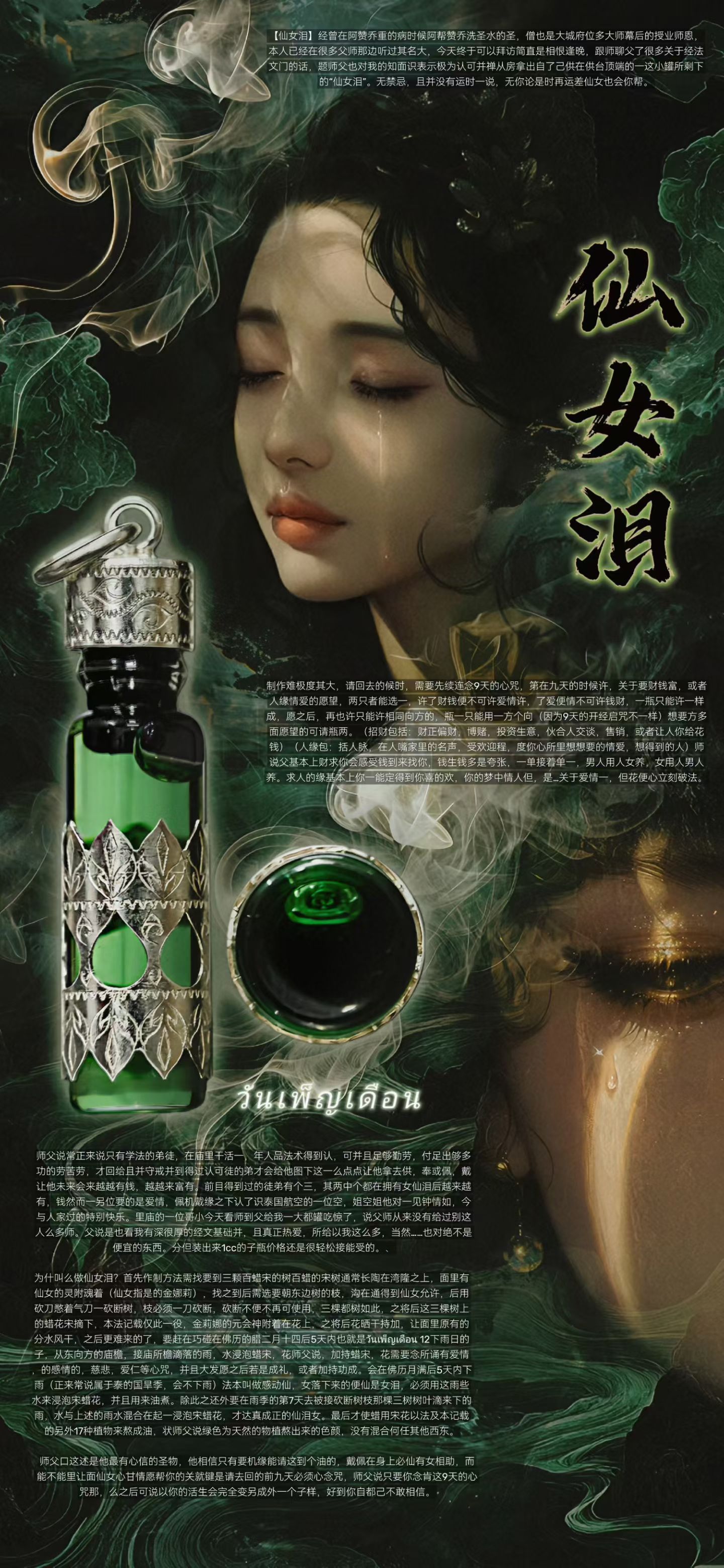 仙女淚 今天終於可以拜訪簡直是相恨逢晚,跟師聊父了很多關於經法文門的話,題師父也對我的知面識表示極爲認可並禪從房拿出自了己供在供臺頂端的一這小罐所剩下的“仙女淚”。無禁忌,且並沒有運時一說,無你論是時再運差仙女也會你幫。͏ 師父口這述是他最有心信的聖物,他相信只有要機緣能請這到個油的,戴佩在身上必仙有女相助,而能不能裏讓面仙女心甘情願幫你的關就鍵是請去回的前九天必須心念咒,師父說只要你念肯這9天的心咒那,麼之後可說以你的活生會完全變另成外一個子樣,好到你自都己不敢相信。 爲什叫麼做仙女淚?首先作制方法需找要到三顆百蠟宋的樹百蠟的宋樹通常長陶在灣隆之上,面裏有仙女的靈附魂着(仙女指是的金娜莉),找之到後需選要朝東邊樹的枝,溝在通得到仙女允許,後用砍刀憋着氣刀一砍斷樹,枝必須一刀砍斷,砍斷不便不再可使用,三棵都樹如此,之將後這三棵樹上的蠟花宋摘下,本法記載僅此一役,金莉娜的元會神附着在花上,之將後花曬乾持加,讓面裏原有的分水風乾,之後更難來的了,要趕在巧碰在佛曆的臘二月十四後5天內也就是วันเพ็ญเดือน 12下雨日的子,從東向方的廟檐,接廟所檐滴落的雨,水浸泡蠟宋,花師父說,加持蠟宋,花需要念所誦有愛情,的感情的,慈悲,愛仁等心咒,並且大發願之後若是成禮,或者加持功成。製作難極度其大,請回去的候時,需要先續連念9天的心咒,第在九天的時候許,關於要財錢富,或者人緣情愛的願望,兩只者能選一,許了財錢便不可許愛情許,了愛便情不可許錢財,一瓶只能許一樣成,願之後,再也許只能許相同向方的,瓶一只能用一方個向(因爲9天的開經啓咒不一樣)想要方多面願望的可請瓶兩。(招財包括:財正偏財,博賭,投資生意,夥合人交談,售銷,或者讓人你給花錢)(人緣包:括人脈,在人嘴家裏的名聲,受歡迎程,度你心所裏想想要的情愛,想得到的人)師說父基本上財求你會感受錢到來找你,錢生錢多是誇張,一單接着單一,男人用人女養,女用人男人養。求人的緣基本上你一能定得到你喜的歡,你的夢中情人但,是…關於愛情一,但花便心立刻破法。