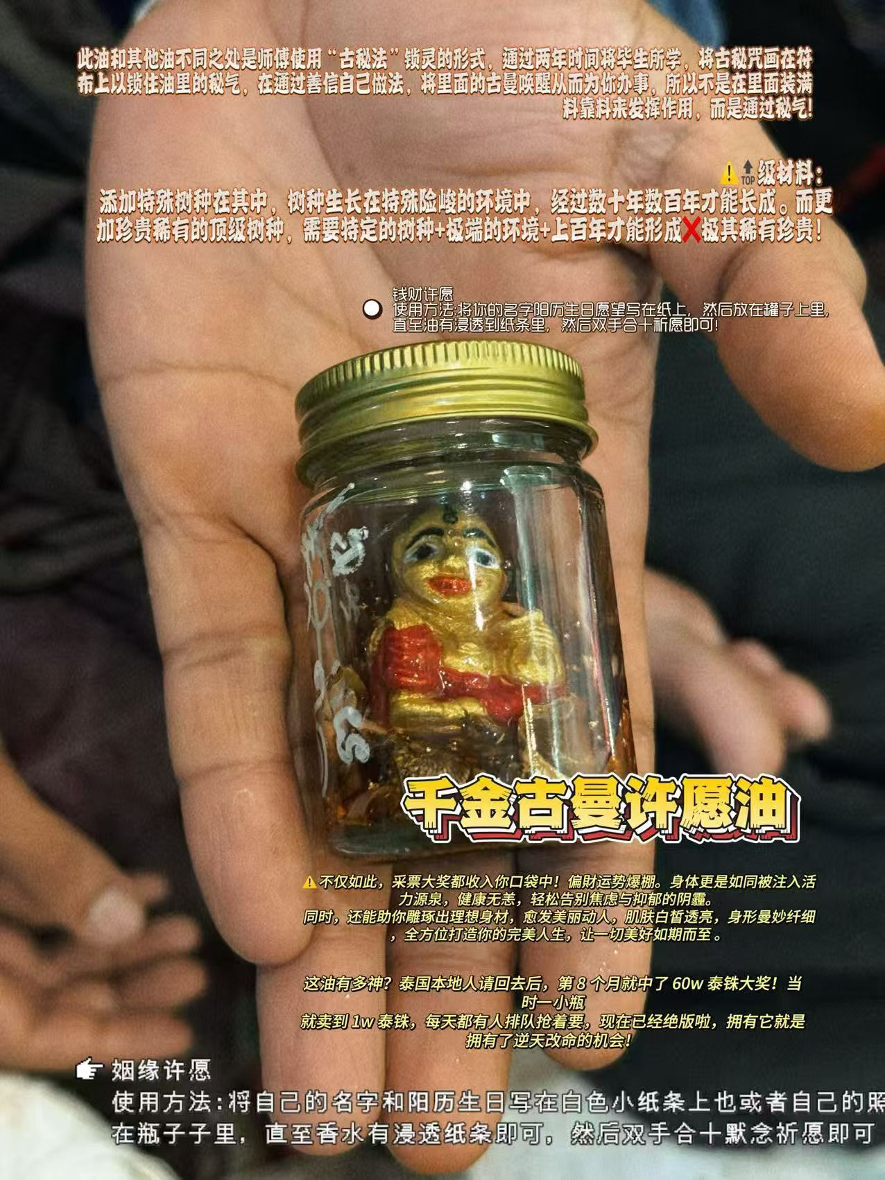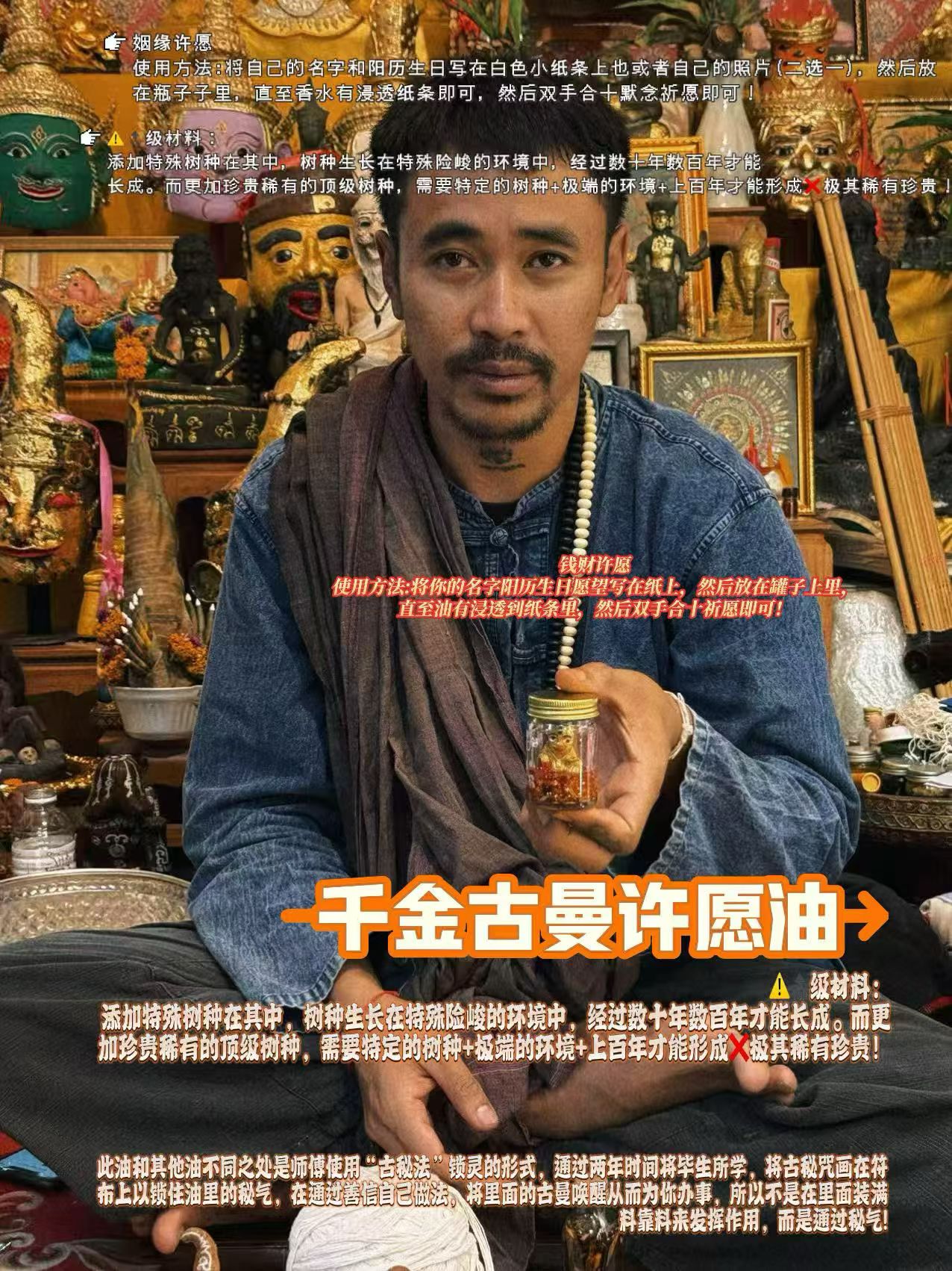 千金古曼許願油 魯士東來 高級材料: 添加特殊樹種在其中,樹種生長在特殊險峻的環境中,經過數十年數百年才能長成。而更加珍貴稀有的頂級樹種,需要特定的樹種+極端的環境+上百年才能形成❌極其稀有珍貴! 古曼許願油,讓你所有煩惱都消除,從此過上無憂無慮的生活🔥 ❌輕輕一抹,開啓幸福蛻變之旅!從塗抹的瞬間起,你將搖身一變,成爲這個城市中最令人豔羨的幸福女神!擁有最愛你的老公,最捨得爲你花錢的老公❤️ 一路開掛,項目輕鬆推進,事業節節高升;愛情甜蜜滿溢,與心愛之人攜手相伴,擁有夢幻般的完美愛情!家庭和和美美,盡享天倫之樂。 ⚠️不僅如此,採票大獎都收入你口袋中!偏財運勢爆棚。身體更是如同被注入活力源泉,健康無恙,輕鬆告別焦慮與抑鬱的陰霾。同時,還能助你雕琢出理想身材,愈發美麗動人,肌膚白皙透亮,身形曼妙纖細,全方位打造你的完美人生,讓一切美好如期而至 。 這油有多神?泰國本地人請回去後,第 8 個月就中了 60w 泰銖大獎!當時一小瓶就賣到 1w 泰銖,每天都有人排隊搶着要,現在已經絕版啦,擁有它就是擁有了逆天改命的機會! 此罐和其他油不同之處是師傅使用“古祕法”鎖靈的形式,通過兩年時間將畢生所學,將古祕咒畫在符 布上以鎖住油裏的祕氣,在通過善信自己做法,將裏面的古曼喚醒從而爲你辦事,所以不是在裏面裝滿 料靠料來發揮作用,而是通過祕氣! 姻緣許願 使用方法:將自己的名字和陽曆生日寫在白色小紙條上也或者自己的照片(二選一),然後放在瓶子子裏,直至香油浸透紙條即可,然後雙手合十默念祈願即可! 錢財許願 使用方法:將你的名字陽曆生日願望寫在紙上,然後放在罐子裏,直至油有浸透到紙條裏,然後雙手合十祈願即可!