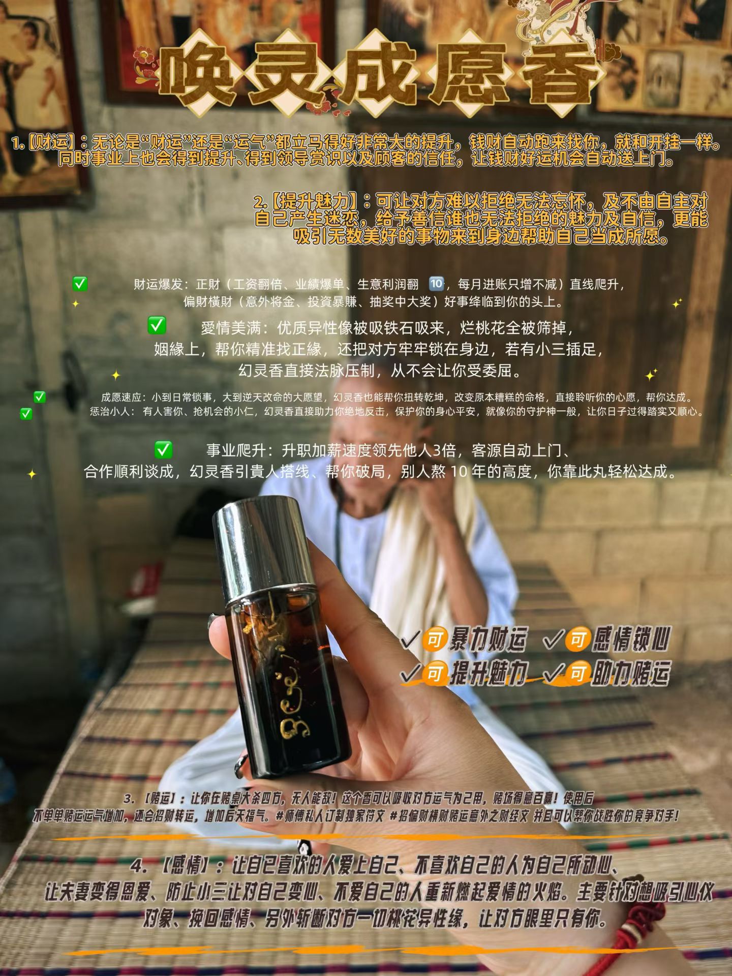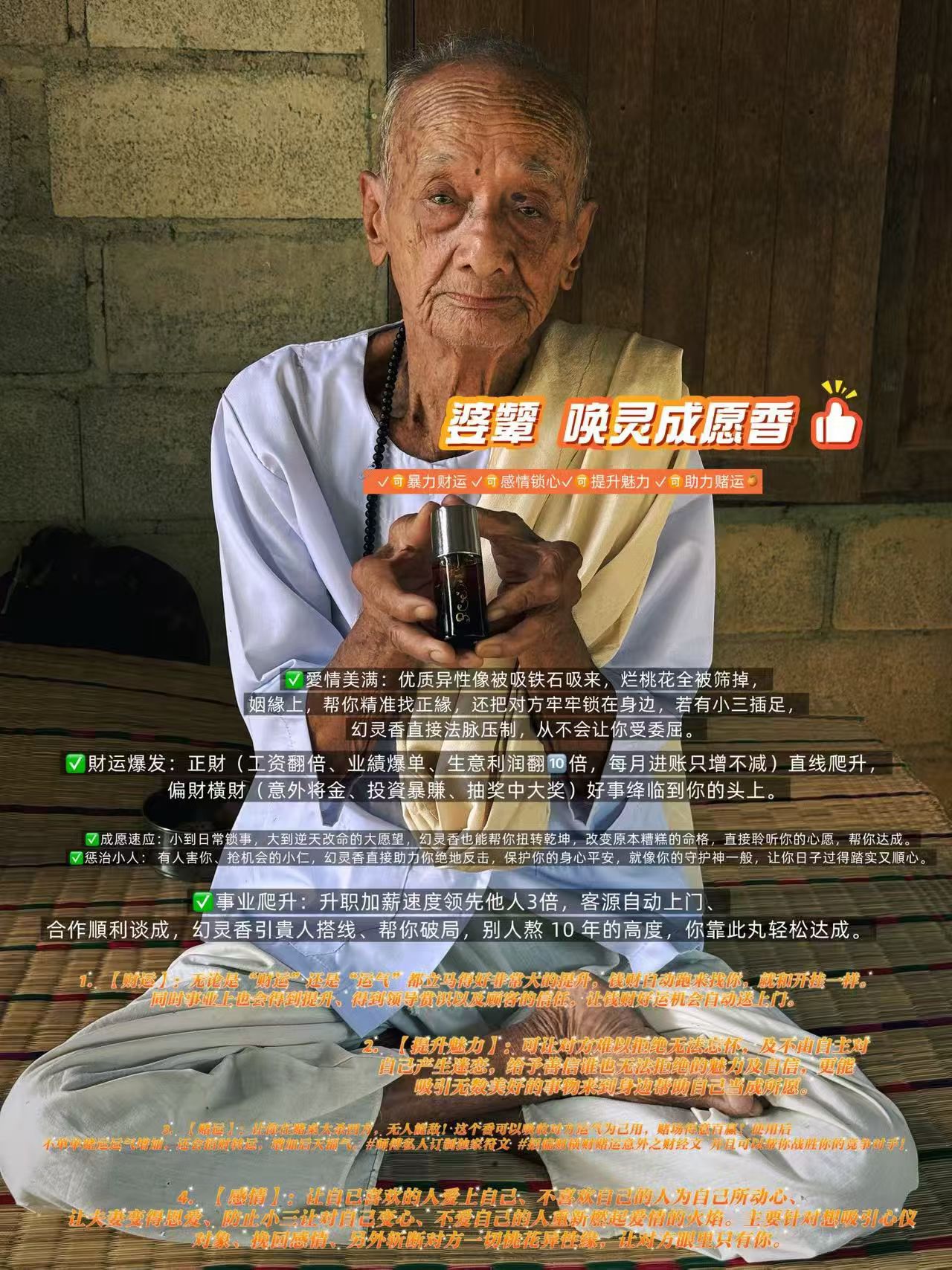 喚靈成願香水/109歲高僧:婆顰 ✓🉑暴力財運 ✓🉑感情鎖心 ✓🉑提升魅力 ✓🉑助力賭運 𝟭. 【財運】:無論是“財運”還是“運氣”都立馬得好非常大的提升,錢財自動跑來找你,就和開掛一樣。同時事業上也會得到提升、得到領導賞識以及顧客的信任,讓錢財好運機會自動送上門。 𝟮. 【提升魅力】:可讓對方難以拒絕無法忘懷,及不由自主對自己產生迷戀,給予善信誰也無法拒絕的魅力及自信,更能吸引無數美好的事物來到身邊幫助自己當成所願。 𝟯. 【賭運】:讓你在賭桌大殺四方,無人能敵!這個香可以吸收對方運氣爲己用,賭場得意百贏!使用後不單單賭運運氣增加,還會招財轉運,增加後天福氣。#師傅私人訂製獨家符文 #招偏財橫財賭運意外之財經文 並且可以幫你戰勝你的競爭對手! 𝟰. 【感情】:讓自已喜歡的人愛上自己、不喜歡自己的人爲自己所動心、讓夫妻變得恩愛、防止小三讓對自己變心、不愛自己的人重新燃起愛情的火焰。主要針對想吸引心儀對象、挽回感情、另外斬斷對方一切桃花異性緣,讓對方眼裡只有你。 ✅財運爆發:正財(工資翻倍、業績爆單、生意利潤翻🔟倍,每月進賬只增不減)直線爬升,偏財橫財(意外將金、投資暴賺、抽獎中大獎)好事絳臨到你的頭上。 ✅愛情美滿:優質異性像被吸鐵石吸來,爛桃花全被篩掉,姻緣上,幫你精準找正緣,還把對方牢牢鎖在身邊,若有小三插足,幻靈香直接法脈壓制,從不會讓你受委屈。 ✅事業爬升:升職加薪速度領先他人3倍,客源自動上門、合作順利談成,幻靈香引貴人搭線、幫你破局,別人熬 10 年的高度,你靠此丸輕鬆達成。 ✅成願速應:小到日常鎖事,大到逆天改命的大願望,幻靈香也能幫你扭轉乾坤,改變原本糟糕的命格,直接聆聽你的心願,幫你達成。 ✅懲治小人: 有人害你、搶機會的小仁,幻靈香直接助力你絕地反擊,保護你的身心平安,就像你的守護神一般,讓你日子過得踏實又順心。