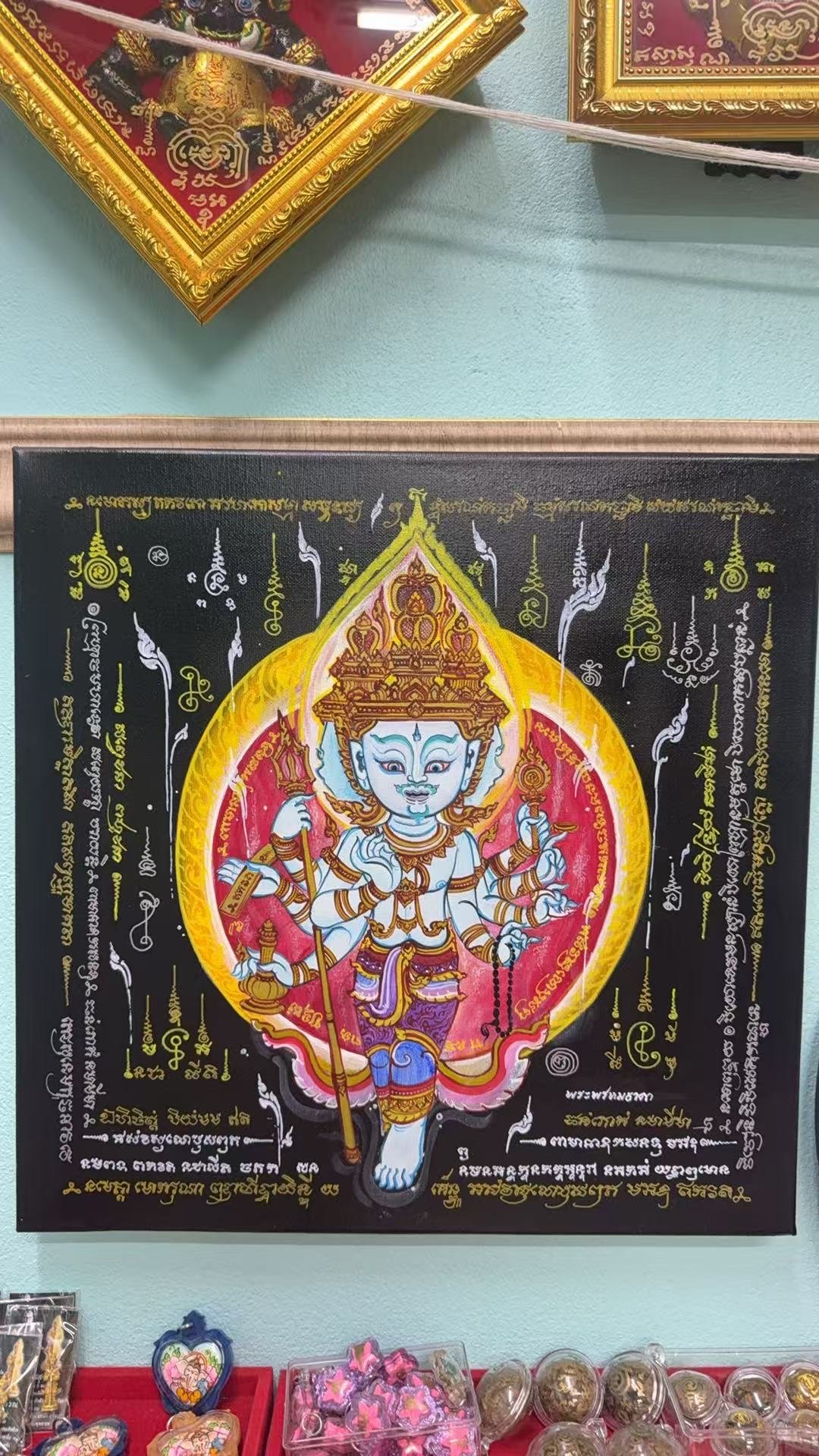 四面神手繪符布畫框 宋柴生前做 每面都有不同功效分別是: 4 1 正面祈求生意、事業、自身; 2 第二面是祈求愛情、婚姻家庭; 3 第三面是祈求財運、富貴; 4 第四面是祈求福慧健康、求子女四面分別代表 愛情、事業、健康與財運,掌管人間的一切事務。 十分靈驗!