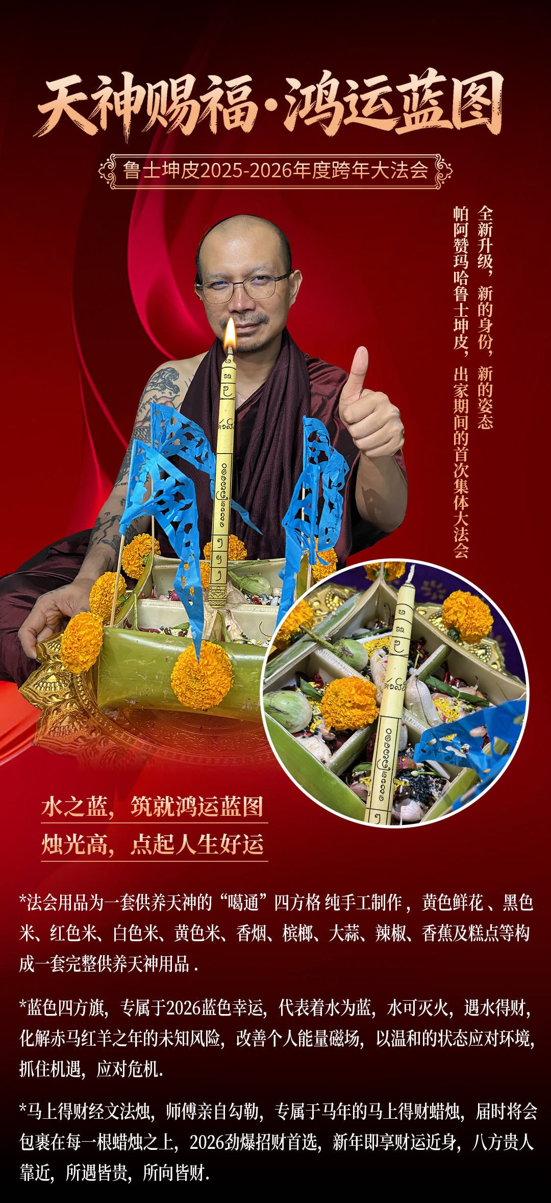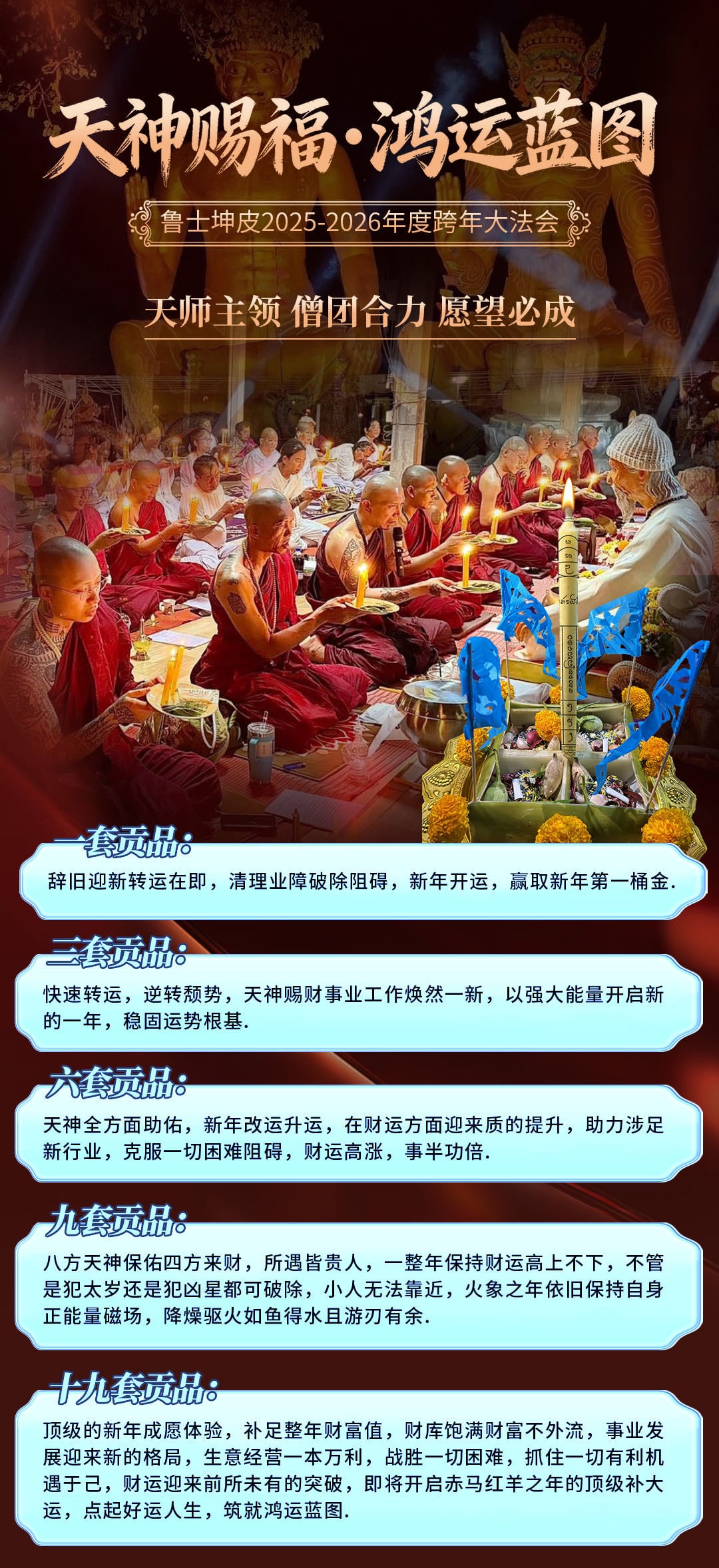 天神賜福•鴻運藍圖 魯士坤皮2025-2026年度跨年大法會 水之藍,遇水生財揚帆起航 渡火運,萬劫可破風生水起 辭舊迎新之際,天師魯士坤皮(現為帕阿贊瑪哈魯士坤皮)將第一次以僧人身份陪善信跨年,於跨年夜舉辦盛大祈福法會回饋善信,以最高規格的法會配置,應時應景的貢品呈現,年度最強加持藍色陣容,以新記憶為主題開啟20萬26,應時應景的新水彩性呈現,年度最強加持藍色的記憶為主題開啟20萬26,為主題開啟新創 跨年12月31日晚,敬請期待… —————————————— [煙火]天神賜福•鴻運藍圖[煙火] 魯士坤皮2025-2026年度跨年大法會 🐎年度跨年之夜,相約天師道場,延續了多年的傳統,坤皮師傅以僧人姿態首次坐鎮主持法會,師傅將藉出家修行期間的無限功德和更高一籌的禪定力量,聯合多位僧人和白衣阿贊共同加持. 🐎2026為火象之年,遇赤馬紅羊之際,機遇與挑戰並存,天神賜福助力開啟新的一年,以足夠的能量化解一切障礙,以藍為主題,水為藍,遇水生財,一套完整的天神貢品搭配經文定制蠟燭,預示著新的一年福滿財滿,享福滿鴻福鴻福鴻福滿福滿。 全新升級,絕對不可錯過的跨年祈福體驗[合十] —————————————— [煙火]天神賜福•鴻運藍圖[煙火] 魯士坤皮2025-2026年度跨年大法會 全新升級,新的身份,新的姿態 帕阿贊瑪哈魯士坤皮,出家期間的首次集體大法會 古法傳承,私人定制,最適合辭舊迎新的跨年法事推薦! 水之藍,築就鴻運藍圖 燭光高,點起人生好運 *法會用品為一套供養天神的「噶通」四方格 👉純手工製作 ,黃色鮮花 、黑色米、紅色米、白色米、黃色米、香煙、檳榔、大蒜、辣椒、香蕉及糕點等構成一套完整供養天神用品 . *藍色四方旗,專屬於2026藍色幸運,代表著水為藍,水可滅火,遇水得財,化解赤馬紅羊之年的未知風險,改善個人能量磁場,以溫和的狀態應對環境,抓住機遇,應對危機. *馬上得財經文法燭,師傅親自勾勒,專屬於馬年的馬上得財蠟燭,屆時將會包裹在每一根蠟燭之上,2026勁爆招財首選,新年即享財運近身,八方貴人靠近,所遇皆貴,所向皆財. ———————————————— [煙火]天神賜福•鴻運藍圖[煙火] 魯士坤皮2025-2026年度跨年大法會 要記住有沒什麼 比你運的勢更可貴 ‼ ️ #沒有改不了的運送 #只有不懂改運的人 🇹🇭魯士坤皮𝐥𝐞𝐬𝐢𝐤𝐮𝐦𝐩𝐞𝐞 𝟐𝟎𝟐𝟔的0時0分,魯士坤皮為你 驅冤走親債主 走趕黴運晦氣 處處遇貴人助相 提升財運 拉升整運體勢順風水順 遇到問題迎而刃解 非常適合❗️本年命 流年不利 運勢低迷 財不運佳 犯太歲 兇煞流年不利所的有人士‼ ️ 務必參加本次魯士坤皮法會❗️❗️ ———————————————— [煙火]天神賜福•鴻運藍圖[煙火] 魯士坤皮2025-2026年度跨年大法會 天師主領 僧團合力 願望必成 🐎一套貢品:辭舊迎新轉運在即,清理業障破除阻礙,新年開運,贏取新年第一桶金. 🐎三套貢品:快速轉運,逆轉頹勢,天神賜財事業工作煥然一新,以強大能量開啟新的一年,穩固運勢根基. 🐎六套貢品:天神全方面助佑,新年改運升運,在財運方面迎來質的提升,助力涉足新行業,克服一切困難阻礙,財運高漲,事半功倍. 🐎九套貢品:八方天神保佑四方來財,所遇皆貴人,一整年保持財運高上不下,不管是犯太歲還是犯凶星都可破除,小人無法靠近,火象之年依舊保持自身正能量磁場,降燥驅火如魚得水刃有餘. 🐎十九套貢品:頂級的新年成願體驗,補足整年財富值,財庫飽滿財富不外流,事業發展迎來新的格局,生意經營一本萬利,戰勝一切困難,抓住一切有利機遇於己,財運迎來前所未有的突破,即將赤馬紅羊之年的頂級補大運,點起好運人生,就運鴻人生藍圖. ————————————————— 即刻可報名參加坤皮師傅跨年法會 12月31日晚,僧人身分的帕阿贊瑪哈坤皮從山上寺廟法駕天師道場,如約為善信舉辦跨年夜祈福,提供資料:照片➕名字➕生日➕新年願望 贏取2026第一桶金,穩固開啟新的運勢格局,百態為新[合十] —————————————————