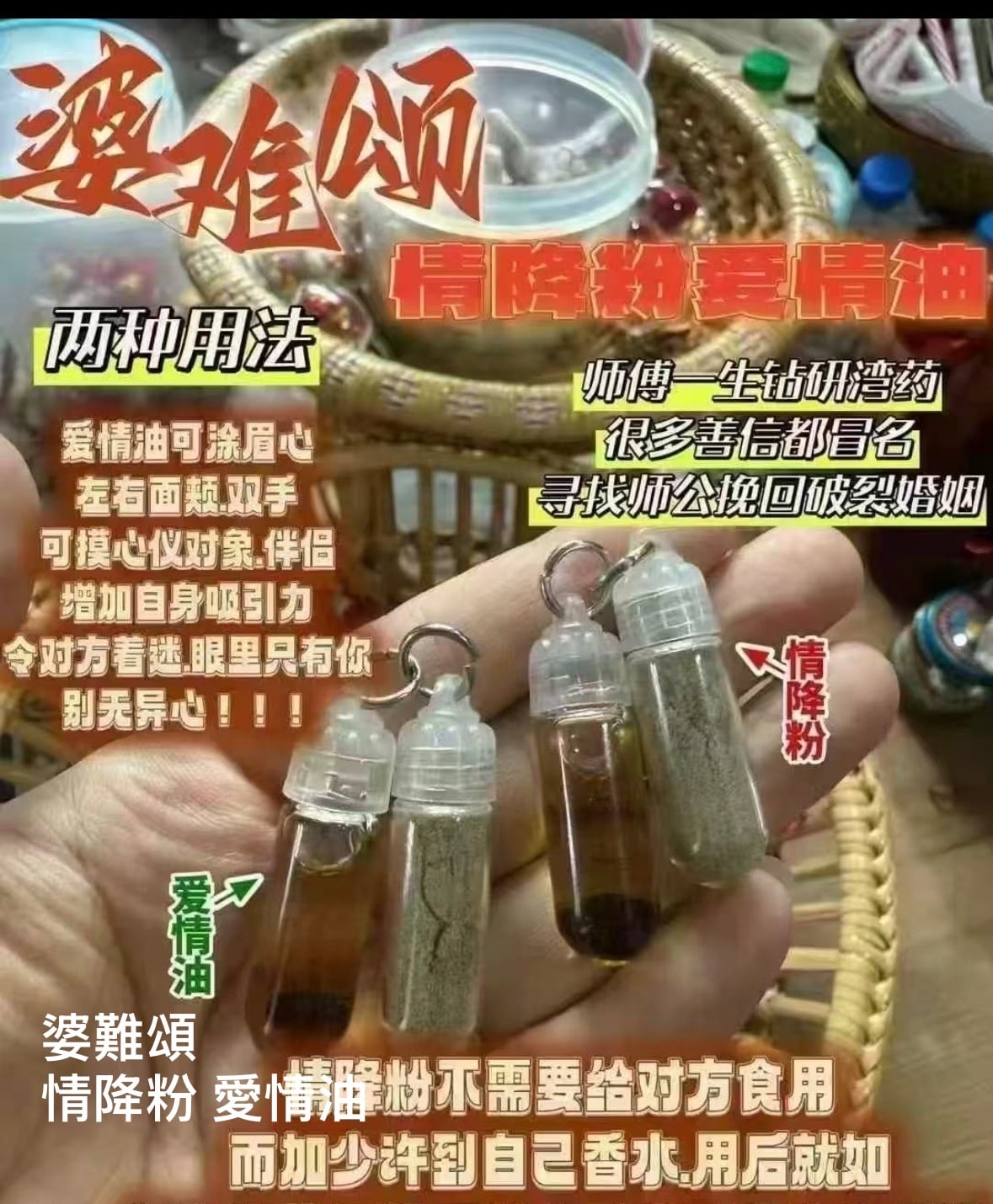 婆難頌 情降粉 愛情油 兩種用法 師傅一生鑽研灣藥 愛情油可塗眉心 左右面頰.雙手 等 可摸心儀對象 很多善信都冒名 尋找師公挽回破裂婚姻 伴侶增加自身吸引力令對方着迷.眼裡只有你別無異心!!! 情降粉不需要給對方食用而加少許到自己香水.用後就如行走的荷爾蒙易挑起對方對你產生興趣吸引對方