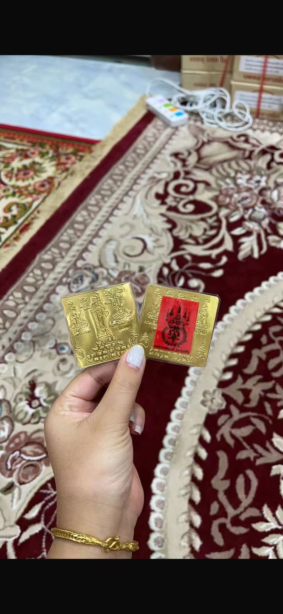 招財女神和希瓦里符片 宋柴 尺寸:5 X 5 CM Item: Phra Nang Kwak/Phra Sivali Unfold Yant Takrut Master: AJ Somchai 此款符片是雙面的,不是二款 符片上有招財女神和希瓦里,讓你招財之餘,更容易遇貴人 不管是做生意、網路拍攝、微商、業務,都非常適合唷! 可放手機背殼、辦公室、工作場所、包包,隨身攜帶,隨時得到師傅的加持。