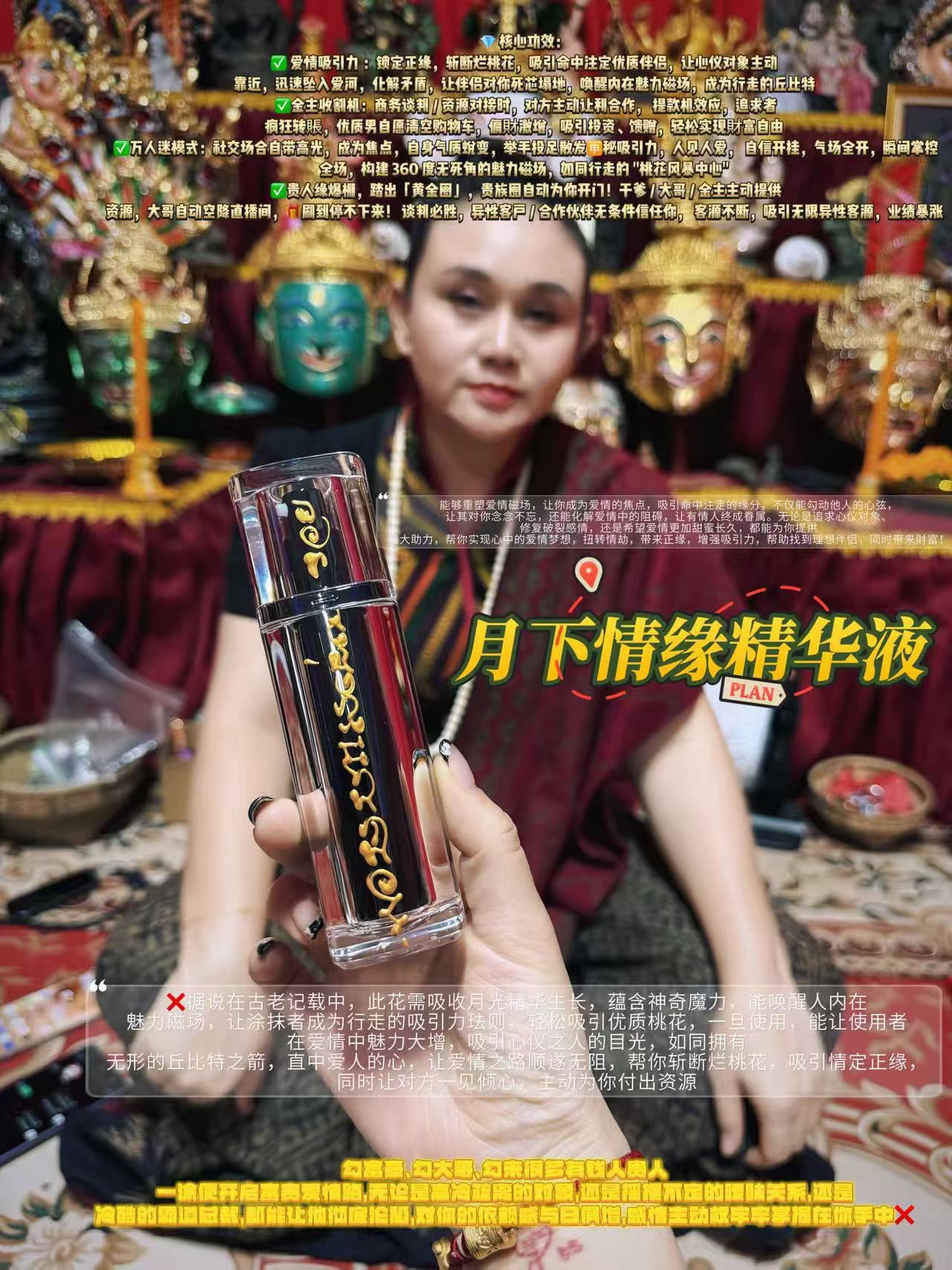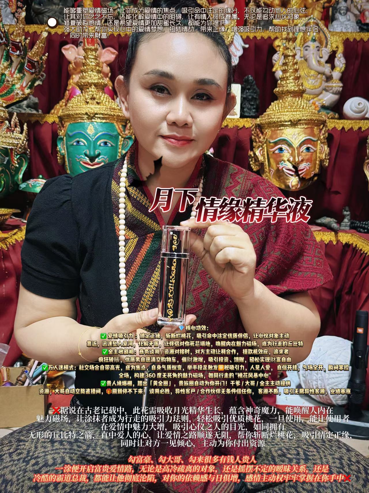 月下情緣精華液 阿贊碧 勾富豪、勾大哥、勾來很多有錢人貴人 一塗便開啓富貴愛情路,無論是高冷疏離的對象,還是搖擺不定的曖昧關係,還是冷酷的霸道總裁,都能讓他徹底淪陷,對你的依賴感與日俱增,感情主動權牢牢掌握在你手中能夠重塑愛情磁場,讓你成爲愛情的焦點,吸引命中註定的緣分,不僅能勾動他人的心絃,讓其對你唸念不忘,還能化解愛情中的阻礙,讓有情人終成眷屬。無論是追求心儀對象、修復破裂感情,還是希望愛情更加甜蜜長久,都能爲你提供強大助力,幫你實現心中的愛情夢想,扭轉情劫,帶來正緣,增強吸引力,幫助找到理想伴侶,同時帶來財富! ❌據說在古老記載中,此花需吸收月光精華生長,蘊含神奇魔力,能喚醒人內在魅力磁場,讓塗抹者成爲行走的吸引力琺則,輕鬆吸引優質桃花,一旦使用,能讓使用者在愛情中魅力大增,吸引心儀之人的目光,如同擁有無形的丘比特之箭,直中愛人的心,讓愛情之路順遂無阻,幫你斬斷爛桃花,吸引情定正緣,同時讓對方一見傾心,主動爲你付出資源 💎 核心功效: ✅ 愛情吸引力 :鎖定正緣,斬斷爛桃花,吸引命中註定優質伴侶,讓心儀對象主動靠近,迅速墜入愛河,化解矛盾,讓伴侶對你死芯塌地,喚醒內在魅力磁場,成爲行走的丘比特 ✅金主收割機:商務談判 / 資源對接時,對方主動讓利合作, 提款機效應,追求者瘋狂轉賬,優質男自願清空購物車,偏財激增,吸引投資、饋贈,輕鬆實現財富自由 ✅萬人迷模式:社交場合自帶高光,成爲焦點,自身氣質蛻變,舉手投足散發🈸祕吸引力,人見人愛, 自信開掛,氣場全開,瞬間掌控全場,構建 360 度無死角的魅力磁場,如同行走的 "桃花風暴中心" ✅貴人緣爆棚,踏出「黃金圈」,貴族圈自動爲你開門!乾爹 / 大哥 / 金主主動提供資源,大哥自動空降直播間,🎁刷到停不下來! 談判必勝,異性客戶 / 合作伙伴無條件信任你, 客源不斷,吸引無限異性客源,業績暴漲