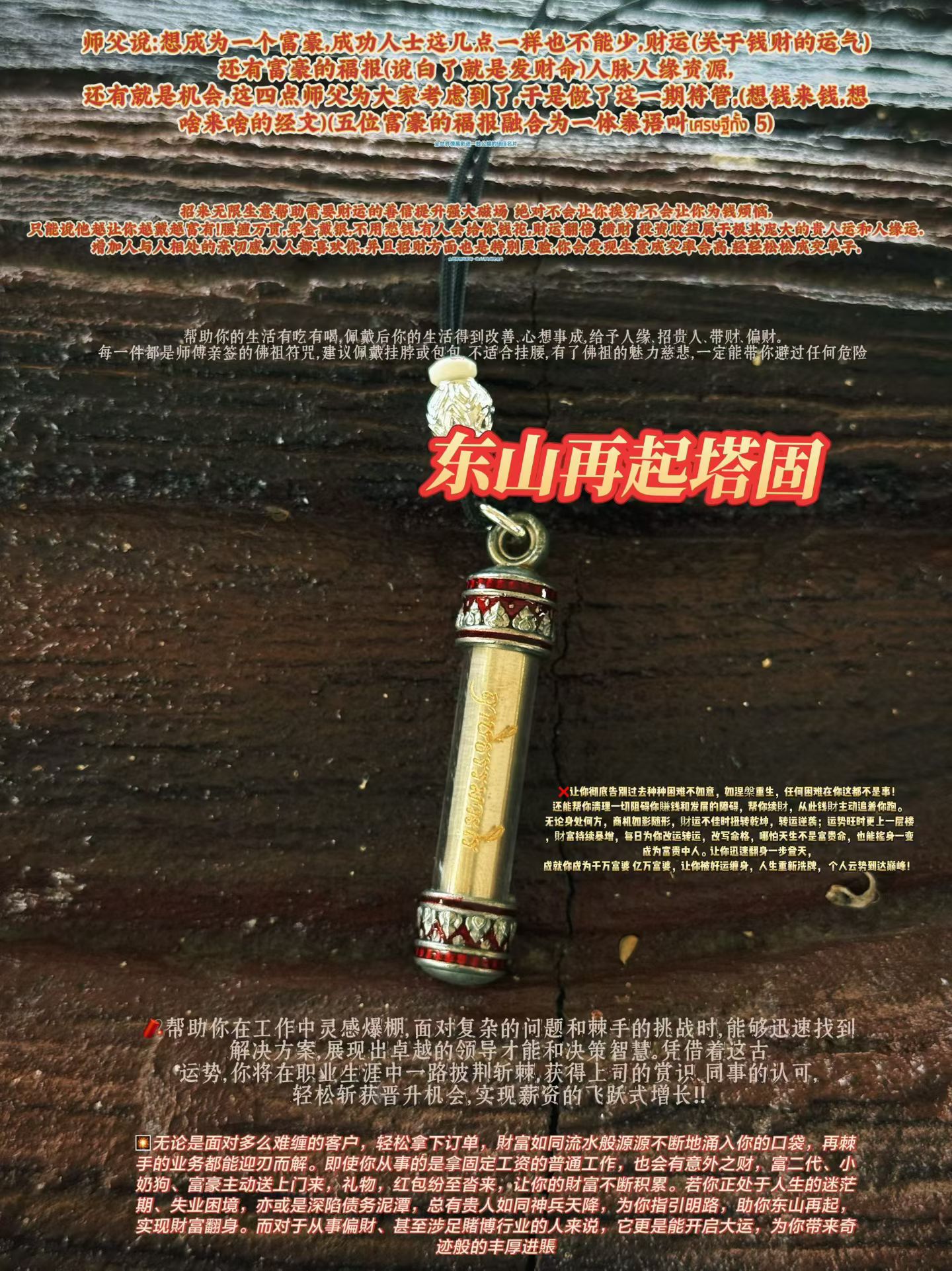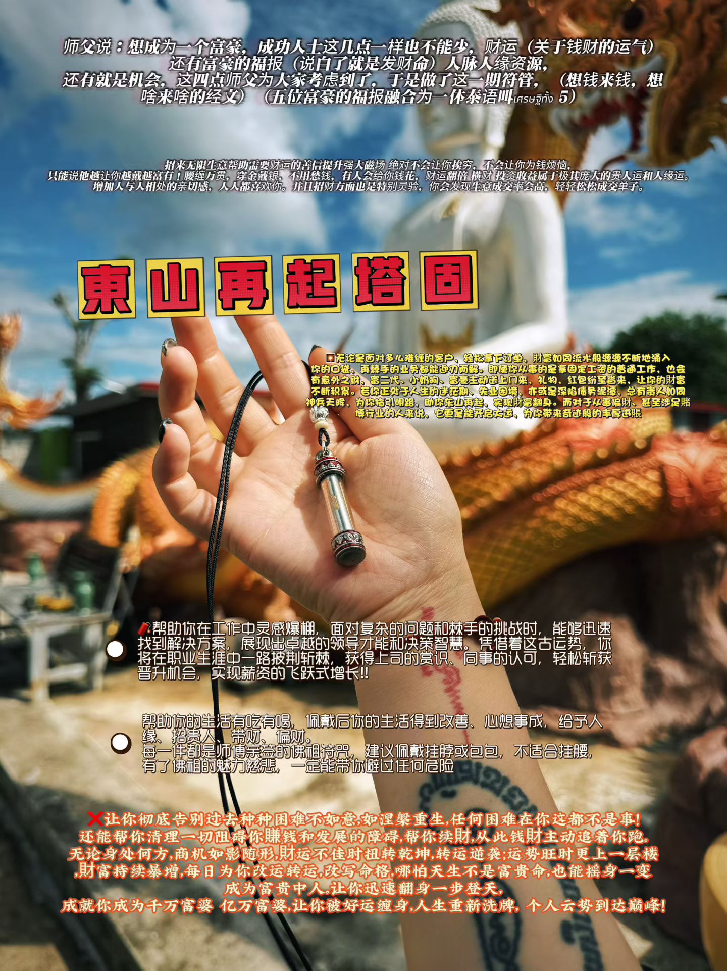 東山再起塔固 阿贊斗 師父說:想成爲一個富豪,成功人士這幾點一樣也不能少,財運(關於錢財的運氣)還有富豪的福報(說白了就是發財命)人脈人緣資源,還有就是機會,這四點師父爲大家考慮到了,於是做了這一期符管,(想錢來錢,想啥來啥的經文)(五位富豪的福報融合為一體泰語叫เศรษฐีทั้ง 5) 招來無限生意幫助需要財運的善信提升強大磁場 絕對不會讓你挨窮,不會讓你爲錢煩惱,只能說他越讓你越戴越富有!腰纏萬貫,穿金戴銀,不用愁錢,有人會給你錢花,財運翻倍 橫財 投資收益屬於極其龐大的貴人運和人緣運。增加人與人相處的親切感,人人都喜歡你。並且招財方面也是特別靈驗,你會發現生意成交率會高,輕輕鬆鬆成交單子。 ❌讓你徹底告別過去種種困難不如意,如涅槃重生,任何困難在你這都不是事!還能幫你清理一切阻礙你賺錢和發展的障礙,幫你續財,從此錢財主動追着你跑。 無論身處何方,商機如影隨形,財運不佳時扭轉乾坤,轉運逆襲;運勢旺時更上一層樓,財富持續暴增,每日爲你改運轉運,改寫命格,哪怕天生不是富貴命,也能搖身一變成爲富貴中人。讓你迅速翻身一步登天,成就你成爲千萬富婆 億萬富婆,讓你被好運纏身,人生重新洗牌, 個人雲勢到達巔峯!🎇無論是面對多麼難纏的客戶,輕鬆拿下訂單,財富如同流水般源源不斷地涌入你的口袋,再棘手的業務都能迎刃而解。即使你從事的是拿固定工資的普通工作,也會有意外之財,富二代、小奶狗、富豪主動送上門來,禮物,紅包紛至沓來,讓你的財富不斷積累。若你正處於人生的迷茫期、失業困境,亦或是深陷債務泥潭,總有貴人如同神兵天降,爲你指引明路,助你東山再起,實現財富翻身。而對於從事偏財、甚至涉足賭博行業的人來說,它更是能開啓大運,爲你帶來奇蹟般的豐厚進賬 🧨幫助你在工作中靈感爆棚,面對複雜的問題和棘手的挑戰時,能夠迅速找到解決方案,展現出卓越的領導才能和決策智慧。憑藉著這古運勢,你將在職業生涯中一路披荊斬棘,獲得上司的賞識、同事的認可,輕鬆斬獲晉升機會,實現薪資的飛躍式增長‼ 幫助你的生活有吃有喝,佩戴後你的生活得到改善、心想事成,給予人緣、招貴人、帶財、偏財。 每一件都是師傅親籤的佛祖符咒,建議佩戴掛脖或包包,不適合掛腰,有了佛祖的魅力慈悲,一定能帶你避過任何危險