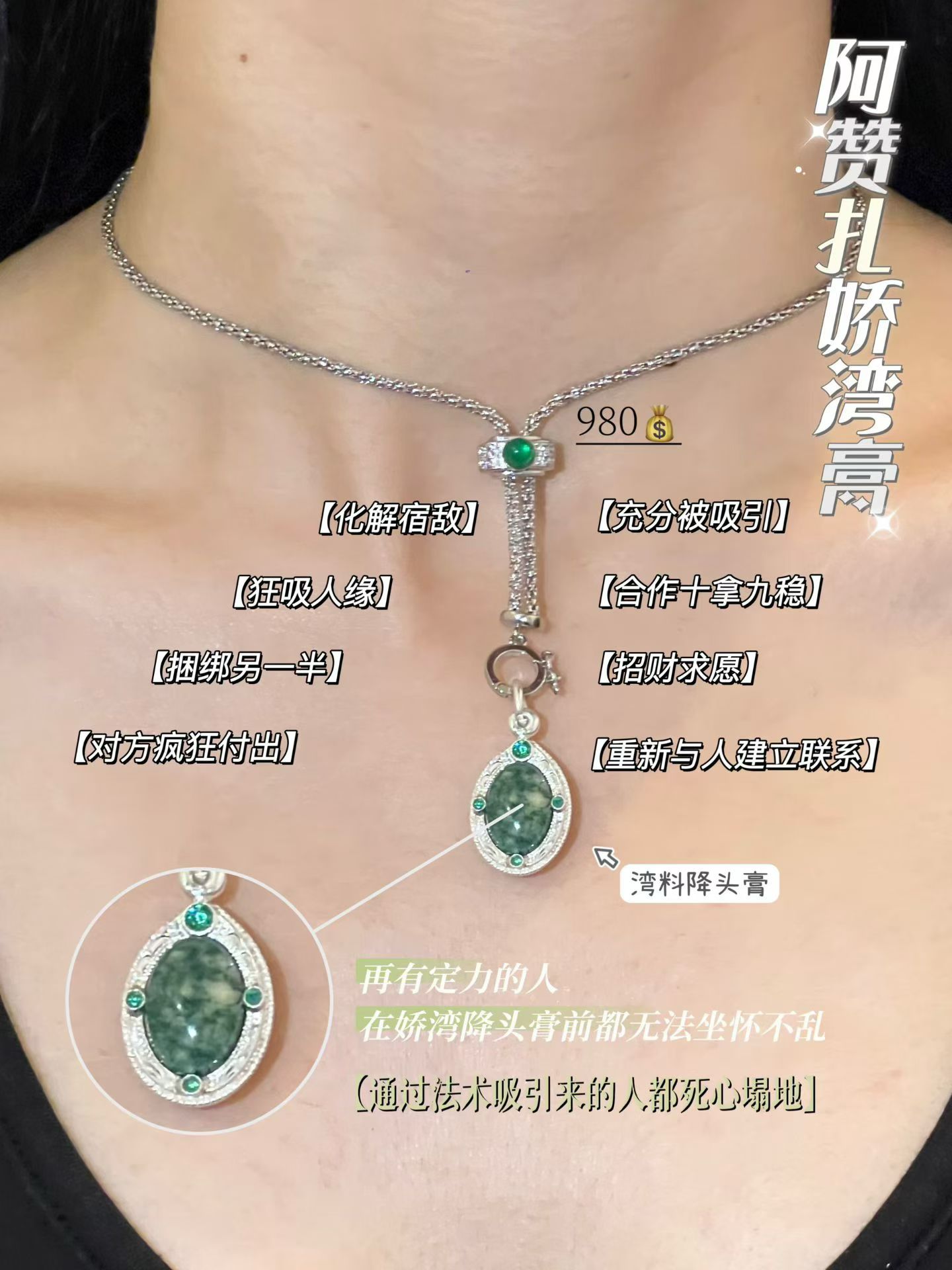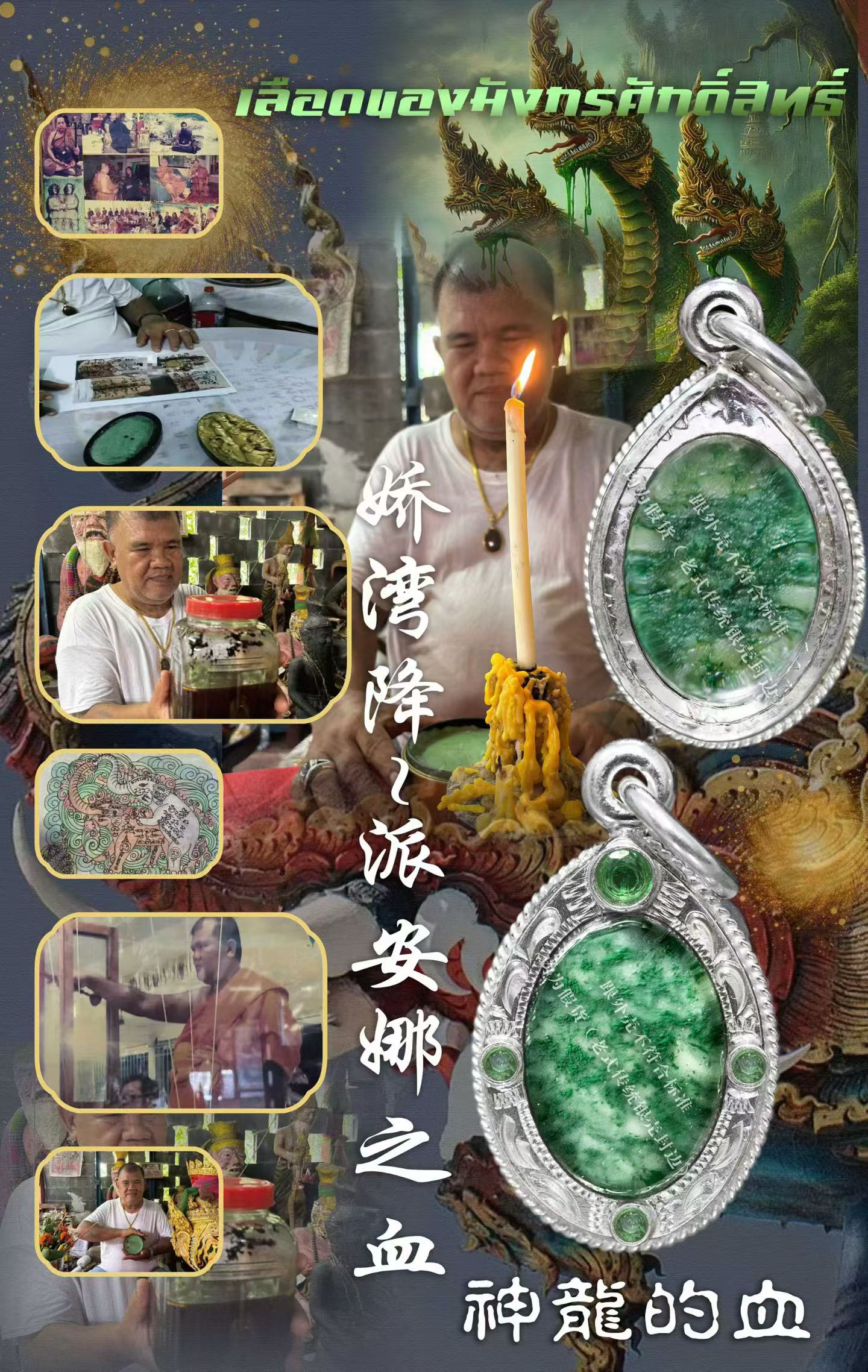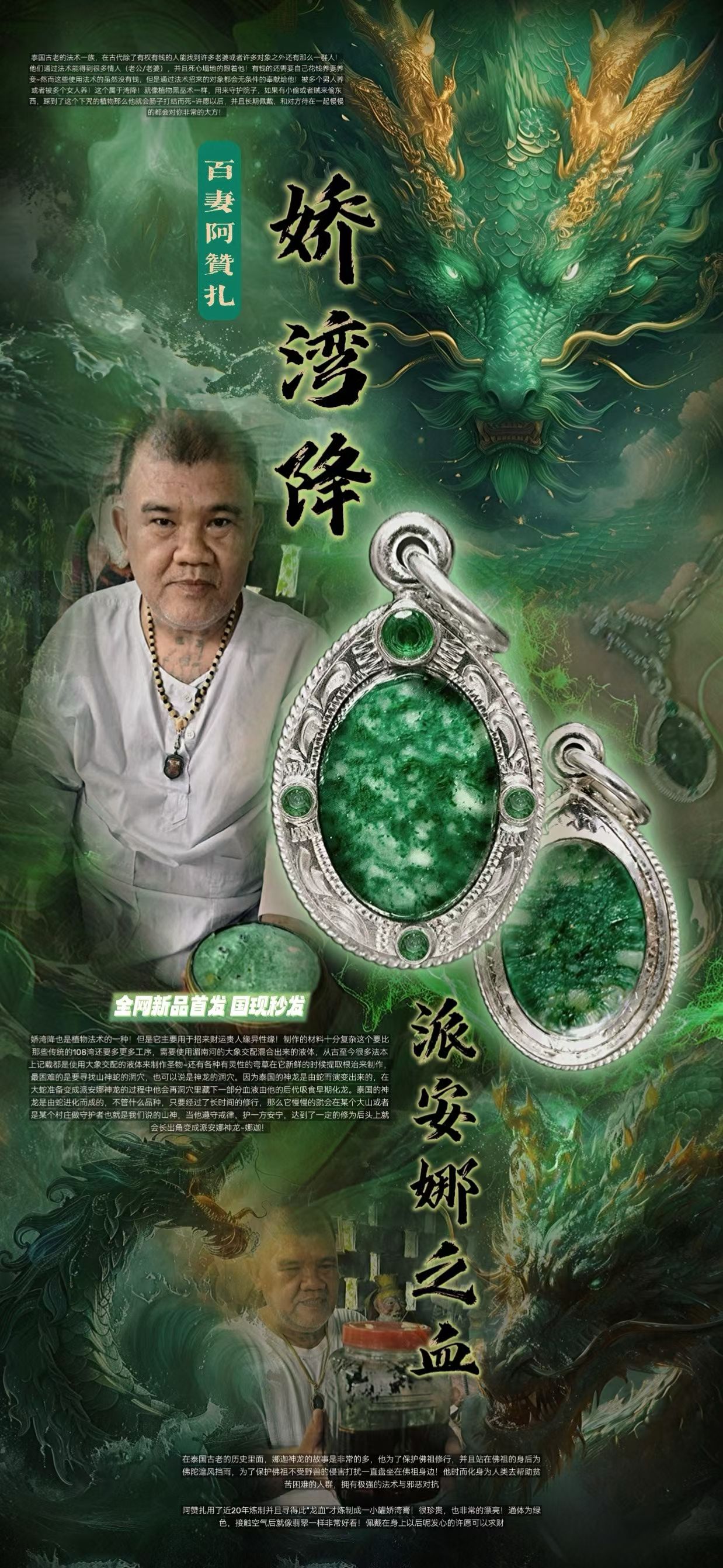 百妻阿贊扎——嬌灣降 派安娜的血(正牌) 嬌灣降~派安娜之血 用實際證明他的力量!百妻阿贊扎 沒錯,師傅有100個妻子,並且每個都對他百依百順!師傅說他年輕的時候還是一個定力很高的僧人,這個法術嬌灣降是他的師傅傳給他的,當時他的師傅告訴他這個法術非常的厲害,並且能招來很多異性緣,自己這一生不會還俗了,但是呢要把這個法門傳給下一代所以全教給了阿贊扎。那時候阿贊扎還不相信,為了驗證他師傅說的話便還俗苦修這個法門並且花了很多年的時間去收集記載的材料來煉製嬌灣膏!踏遍泰國各個角落以及老撾,出乎意料的是他日復一日的修行這個法術過程中就來了非常多仰慕他的異性,很多女人和他聊天,並且說要供養他或者給他買禮物,哪怕是進入村子準備進山採集材料,都會有女孩子莫名跟着他......後來就有了100個老婆.......包括有一些海外的信士來找他做法或求聖物,不到給錢阿贊扎並且還會對他有一定的春宵暗示~~誇張的是師傅的這些老婆關係都非常的好,相互幫忙,相互分擔並且把阿贊扎照顧的非常好。 嬌灣降也是植物法術的一種!但是它主要用於招來財運貴人緣異性緣!製作的材料十分複雜這個要比那些傳統的108灣還要多更多工序,需要使用湄南河的大象交配混合出來的液體,從古至今很多法本上記載都是使用大象交配的液體來製作聖物~還有各種有靈性的彎草在它新鮮的時候提取根治來製作,最困難的是要尋找山神蛇的洞穴,也可以說是神龍的洞穴。因爲泰國的神龍是由蛇而演變出來的,在大蛇準備變成派安娜神龍的過程中他會再洞穴裏藏下一部分血液由他的後代吸食早期化龍。泰國的神龍是由蛇進化而成的,不管什麼品種,只要經過了長時間的修行,那麼它慢慢的就會在某個大山或者是某個村莊做守護者也就是我們說的山神,當他遵守戒律,護一方安寧,達到了一定的修爲後頭上就會長出角變成派安娜神龍~娜迦! 如果你有對象,對你愛答不理。那麼通過這個稿可以改善對方,更捨得爲你付出!這方面用途太廣了,在當今的社會上,各個方面領域都可以起到很大的幫助!你賣東西,客人會比別人多,你的工作會有貴人來幫你,會給你帶來更多的人緣,粉絲,戴着和你喜歡的人說話,或者是態度很不好的人說話都會得到改變,對方願意回覆你,並且緩和你們之間的關係,或者是更加對你有關注喜歡你!如果你是一個很花心的人,那麼佩戴此物一定要注意身體虧虛~希望大家不要用此物來玩弄感情,而是把它發揮到最大的價值,一切向錢看!師傅加持了很久,所有的咒在會在裏面,只需要有個人佩戴或者告訴他需求即可散發出能量! 沒有得手的對方就會擁入你的懷抱,並且對你百依百順,關係不好,把你拉黑了,這些都會得到一定的緩和,重新建立,恢復往常的關係,並且再進一步發展。如果你們夫妻吵架,冷戰還是怎麼樣的,也是想一樣可以的!平常對方對你很小氣。許願以後,並且長期佩戴,和對方待在一起慢慢的都會對你非常的大方!