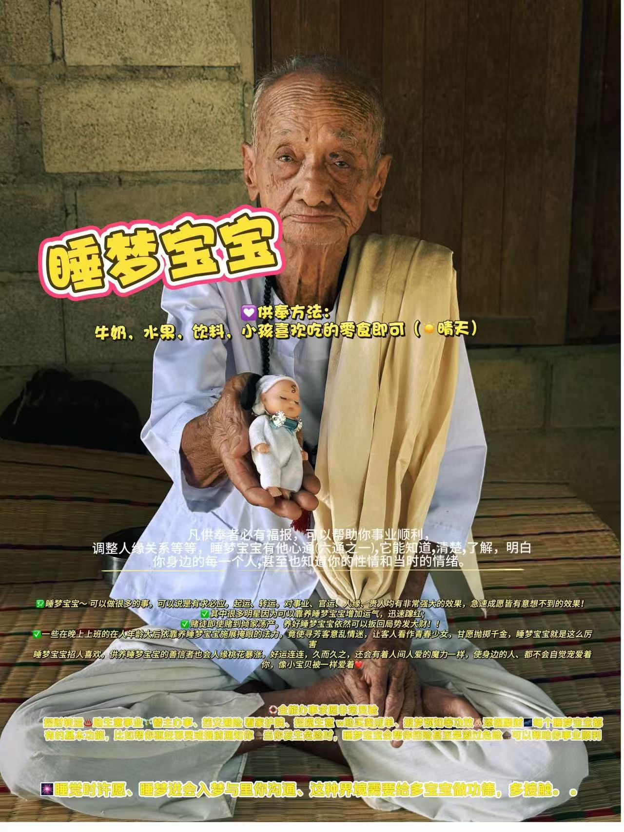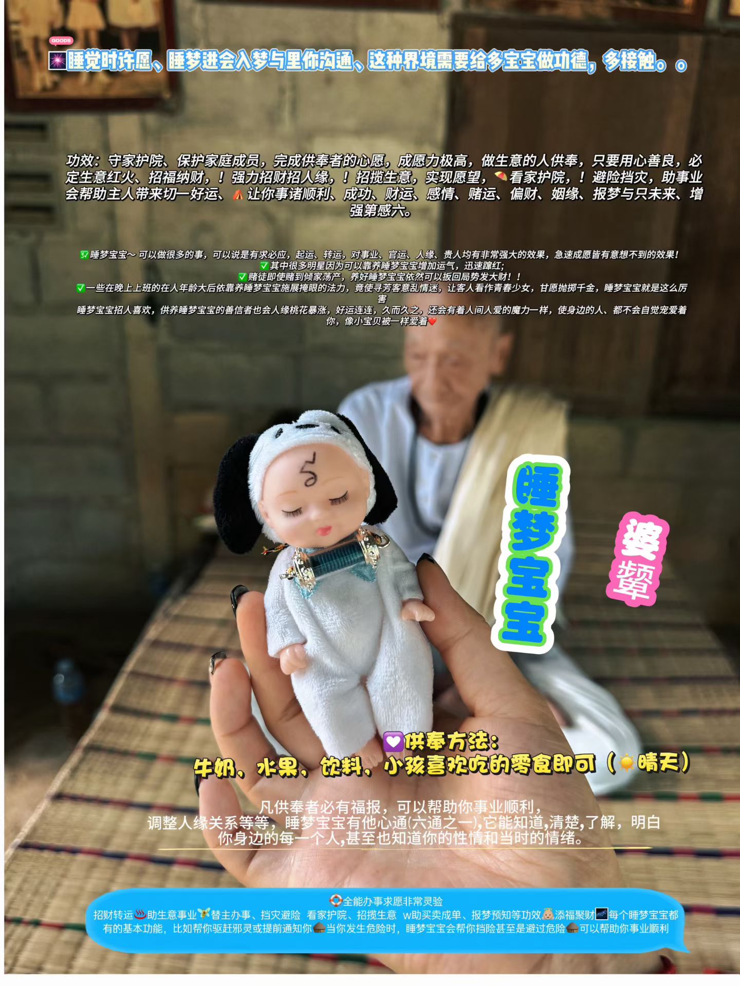 睡夢寶寶 109歲高僧:婆顰 靈力強大!招正偏財💰、招人緣、助事業順利 生意興隆、助成功,完成供奉者的心願,成願力極高,做生意的人供奉,只要用心善良,必定生意紅火🔥、招福納財另外睡夢寶寶相當護主,幫助守家護院、保護家庭成員,幫你祛除一些不好的事,強力擋險、保佑平安順利可放店裡、家裏。 🛟全能辦事求願非常靈驗 招財轉運♨助生意事業🧚♂️替主辦事、擋災避險 看家護院、招攬生意 w助買賣成單、報夢預知等功效👼🏼添福聚財🌌每個睡夢寶寶都有的基本功能,比如幫你驅趕邪靈或提前通知你🛖當你發生危險時,睡夢寶寶會幫你擋險甚至是避過危險🛖可以幫助你事業順利 🎆睡覺時許願、睡夢進會入夢與裏你溝通、這種界境需要給多寶寶做功德,多接觸。 。 💹睡夢寶寶~ 可以做很多的事,可以說是有求必應,起運、轉運,對事業、官運、人緣、貴人均有非常強大的效果,急速成願皆有意想不到的效果! ✅其中很多明星因爲可以靠養睡夢寶寶增加運氣,迅速躥紅; ✅賭徒即使賭到傾家蕩產,養好睡夢寶寶依然可以扳回局勢發大財!! ✅一些在晚上上班的在人年齡大後依靠養睡夢寶寶施展掩眼的法力,竟使尋芳客意亂情迷,讓客人看作青春少女,甘願拋擲千金,睡夢寶寶就是這麼厲害 睡夢寶寶招人喜歡,供養睡夢寶寶的善信者也會人緣桃花暴漲,好運連連,久而久之,還會有着人間人愛的魔力一樣,使身邊的人、都不會自覺寵愛着你,像小寶貝被一樣愛着❤ 💟供奉方法: 牛奶,水果,飲料,小孩喜歡吃的零食即可(☀晴天) 凡供奉者必有福報,可以幫助你事業順利,調整人緣關係等等,睡夢寶寶有他心通(六通之一),它能知道,清楚,暸解,明白你身邊的每一個人,甚至也知道你的性情和當時的情緒。 功效:守家護院、保護家庭成員,完成供奉者的心願,成願力極高,做生意的人供奉,只要用心善良,必定生意紅火、招福納財,!強力招財招人緣,!招攬生意,實現願望,⛱️看家護院,!避險擋災,助事業 會幫助͏ 主人帶來切一好運、⛺️讓你事諸順利、成功、財運、感情、賭運、偏財、姻緣、報夢與只未來、增強第感六。