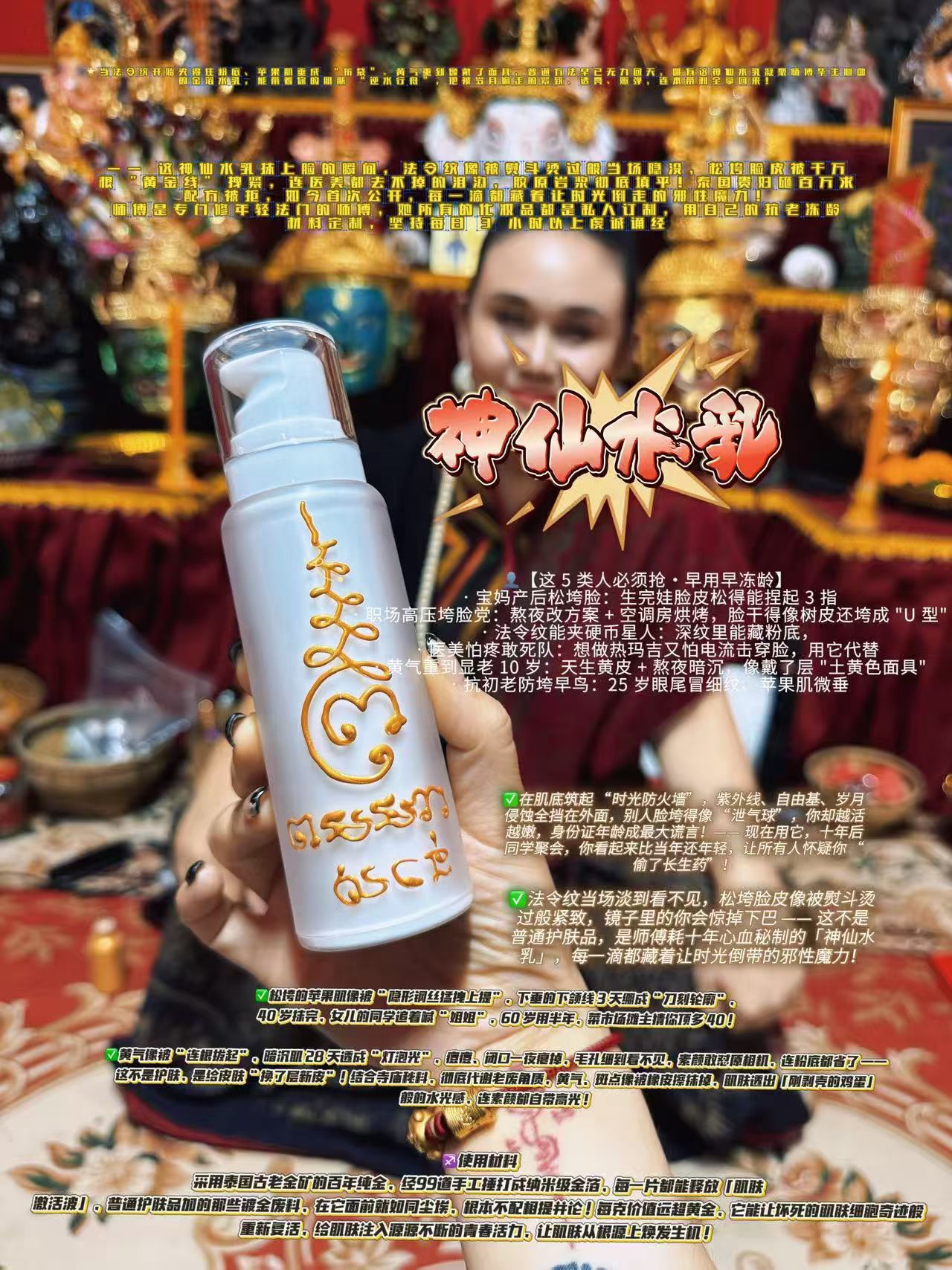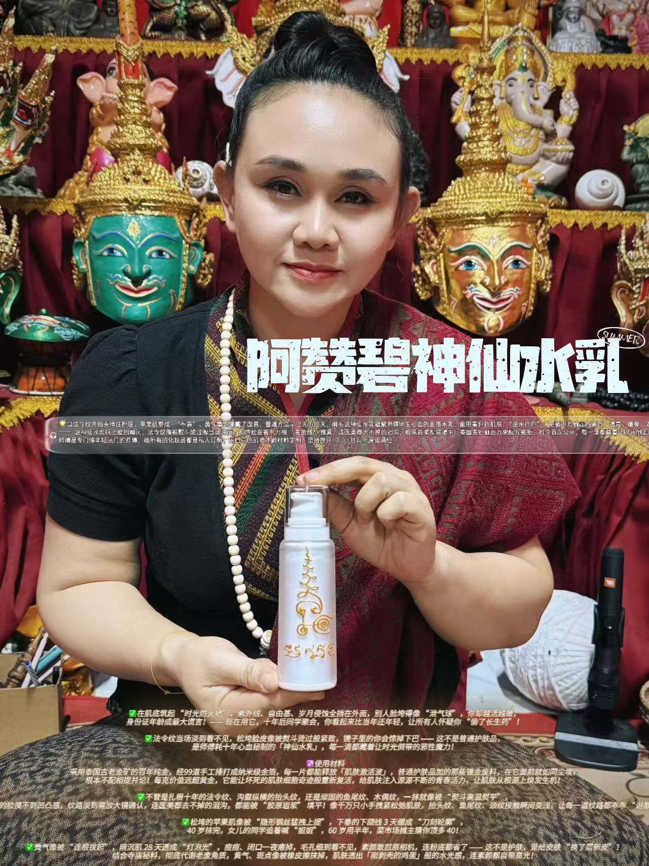 神仙水乳 阿贊碧 抹上臉的瞬間,法令紋像被熨斗燙過般當場隱沒,鬆垮臉皮被千萬根 "黃金線" 拽緊,連醫美都去不掉的淚溝,膠原岩漿徹底填平!泰國貴婦砸百萬求配方被拒,如今首次公開,每一滴都藏着讓時光倒走的邪性魔力! 師傅是專門修年輕法門的師傅,她所有的化妝品都是私人訂製,用自己的抗老凍齡材料訂製,堅持每日 3 小時以上虔誠誦經 ✅在肌底築起 “時光防火牆”,紫外線、自由基、歲月侵蝕全擋在外面,別人臉垮得像 “泄氣球”,你卻越活越嫩,身份證年齡成最大謊言!—— 現在用它,十年後同學聚會,你看起來比當年還年輕,讓所有人懷疑你 “偷了長生藥”! ✅法令紋當場淡到看不見,鬆垮臉皮像被熨斗燙過般緊緻,鏡子裏的你會驚掉下巴 —— 這不是普通護膚品,是師傅耗十年心血祕製的「神仙水乳」,每一滴都藏着讓時光倒帶的邪性魔力! ♐使用材料 採用泰國古老金礦的百年純金,經99道手工捶打成納米級金箔,每一片都能釋放「肌膚激活波」,普通護膚品加的那些鍍金廢料,在它面前就如同塵埃,根本不配相提並論!每克價值遠超黃金,它能讓壞死的肌膚細胞奇蹟般重新復活,給肌膚注入源源不斷的青春活力,讓肌膚從根源上煥發生機!