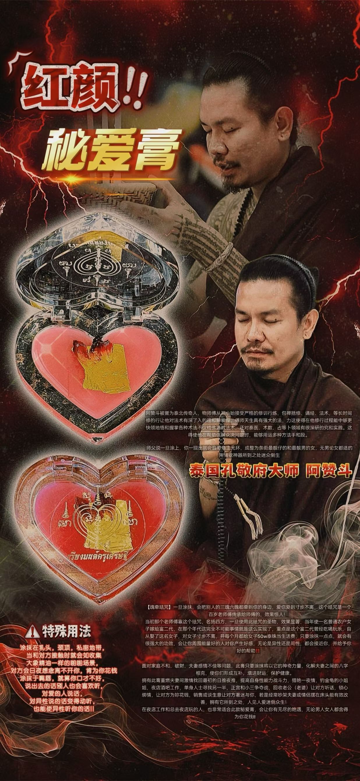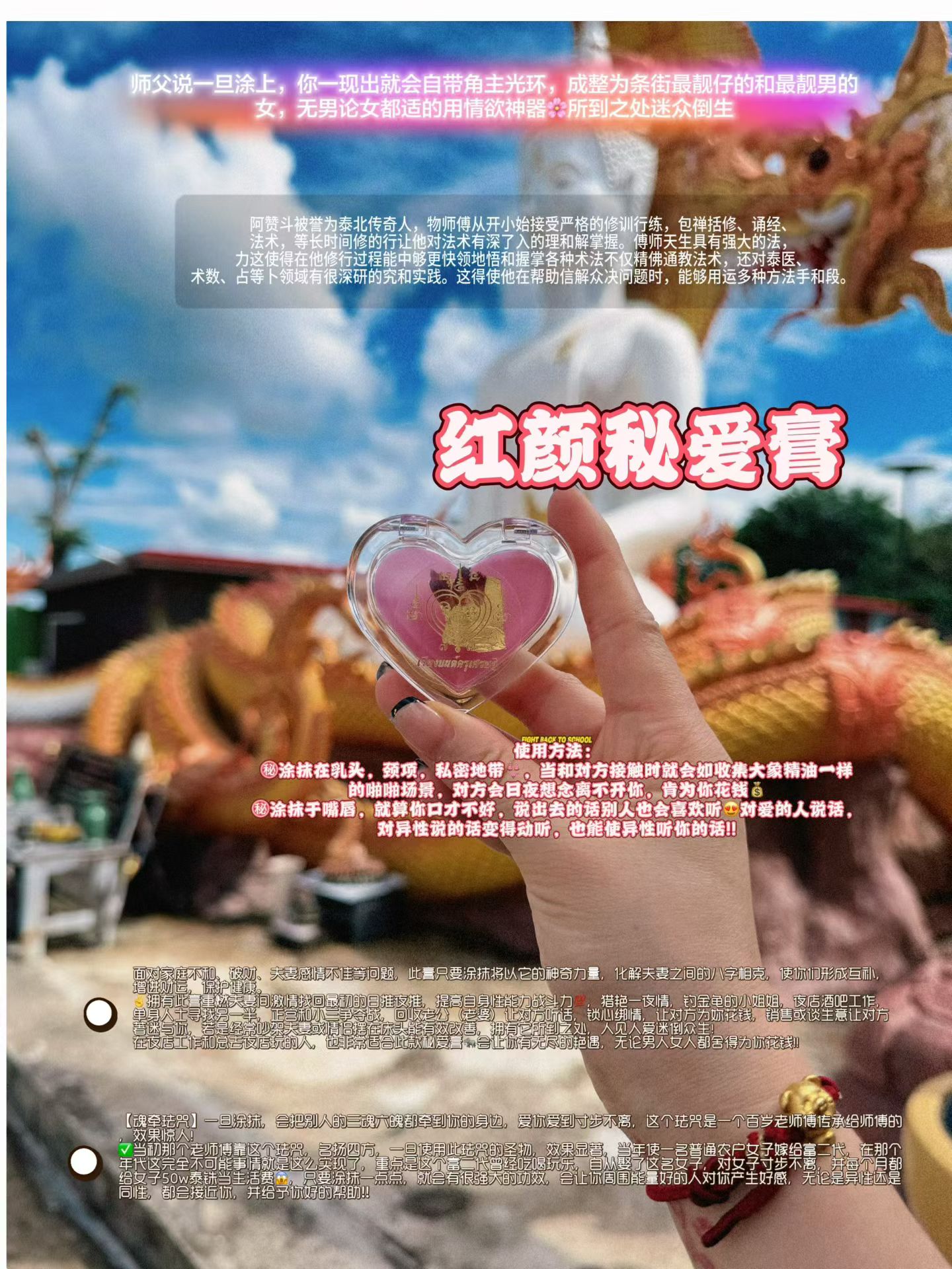 紅顏祕愛膏 阿贊斗 師父說一旦塗上,你一現出就會自帶角主光環,成整爲條街最靚仔的和最靚男的女,無男論女都適的用情慾神器🌸所到之處迷衆倒生 阿贊鬥被譽爲泰北傳奇人,物師傅從開小始接受嚴格的修訓行練,包禪括修、誦經、法術,等長時間修的行讓他對法術有深了入的理和解掌握。傅師天生具有強大的法,力這使得在他修行過程能中夠更快領地悟和握掌各種術法不僅精佛通教法術,還對泰醫、術數、佔等卜領域有很深研的究和實踐。這得使他在幫助信解衆決問題時,能夠用運多種方法手和段。 【魂牽琺咒】一旦塗抹,會把別人的三魂六魄都牽到你的身邊,愛你愛到寸步不離,這個琺咒是一個百歲老師傅傳承給師傅的,效果驚人! ✅當初那個老師傅靠這個琺咒,名揚四方,一旦使用此琺咒的聖物,效果顯著,當年使一名普通農戶女子嫁給富二代,在那個年代這完全不可能事情就是這麼實現了,重點是這個富二代曾經吃喝玩樂,自從娶了這名女子,對女子寸步不離,並每個月都給女子50w泰銖當生活費😱,只要塗抹一點點,就會有很強大的功效,會讓你周圍能量好的人對你產生好感,無論是異性還是同性,都會接近你,並給予你好的幫助‼ 面對家庭不和、破財、夫妻感情不佳等問題,此膏只要塗抹將以它的神奇力量,化解夫妻之間的八字相剋,使你們形成互補,增進財運,保護健康。 ✌擁有此膏重燃夫妻間激情找回最初的日推夜推,提高自身性能力戰鬥力💯,獵豔一夜情,釣金龜的小姐姐,夜店酒吧工作,單身人士尋找另一半,正宮和小三爭奪戰,回收老公(老婆)讓對方聽話,鎖心綁情,讓對方爲妳花錢,銷售或談生意讓對方著迷與你,若是經常吵架夫妻或情侶擺在牀頭能有效改善,擁有它所到之處,人見人愛迷倒衆生! 在夜店工作和總去夜店玩的人,也非常適合此款祕愛膏🐘會讓你有無盡的豔遇,無論男人女人都捨得爲你花錢!! 使用方法: ㊙塗抹在乳頭,頸項,私密地帶👙,當和對方接觸時就會如收集大象精油一樣的啪啪場景,對方會日夜想念離不開你,肯爲你花錢💰 ㊙塗抹於嘴脣,就算你口才不好,說出去的話別人也會喜歡聽😍對愛的人說話,對異性說的話變得動聽,也能使異性聽你的話!!