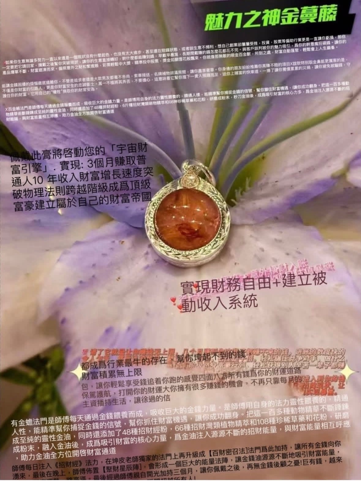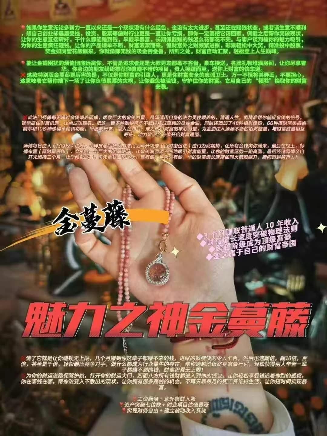 魯士坤皮 金蔓藤純銀吊咀 結合百種極品動植物靈性與珍稀草藥所煉製的頂 級吸金神器 魯士坤皮史上最強版本 專為打破階級、暴富翻身打造短期實現財富爆 增、收入翻百倍 讓你自帶吸金磁場 無敵吸財財富自動追著你跑 典故 傳說金蔓藤源於密林深處為極為罕見的靈性財富 聖物 泰國古法記載其能招來無限金錢與貴人機遇 歷代魯士密不外傳坤皮師傅突破傳統將祖傳法 門結合現代能量陣法進化為百財密召法 大幅提升金蔓藤的吸金速度與能量成為公認的財 富硬通貨 材料與製作 ◆100+種頂級動物靈性精華鍛煉提取 100+種頂級動物靈性精華鍛煉提取 48種招財經粉配製 166種珍稀招財植物精華 ▶108種靈性草藥與花粉研磨 ▶至純靈性金油融合 ▶每日注入《招財經》法力加持 【百財密召法】法門強化靈效 布置【聚財星辰陣】開啟無限吸財通道 功效 極速暴富吸金 短時間內實現暴富,輕鬆翻倍、翻十倍、甚至百 倍,收入增長突破常規,迅速進入富豪行列 W財富磁場全面開啟 幫助改變入不敷出的現狀,開啟強大財運磁場, 無論走到哪裡,錢財都自動追隨 偏財正財一起來吸引意外橫財、投資大獲利、彩票偏財、事業收 入全面提升,錢財主動進帳 W事業頂峰成為行業領頭羊 做什麼都能一鳴驚人,輕鬆碾壓競爭對手,建立 屬於自己的財富帝國 W貴人助力 財運不斷 強力吸引合作貴人、人脈資源、投資機會源源不 絕,走上財富快車道 W招財護財雙重保護 不僅招財快速累積財富,更能守護財富安全,擋 煞避災,避免金錢損失,確保財運穩定增長 W魅力提升財色雙收 散發超強個人魅力,讓合作夥伴、客戶、異性、 貴人對你另眼相看,願意為你投入資源或財富 適用人群 !!想突破收入瓶頸、階級翻身者 !!投資股票、彩票、意外財領域人士 !!經商創業、爆單、招財需求者 !!想改善財運、遠離貧窮者 !!想打造無限收入體系、財富自由人士