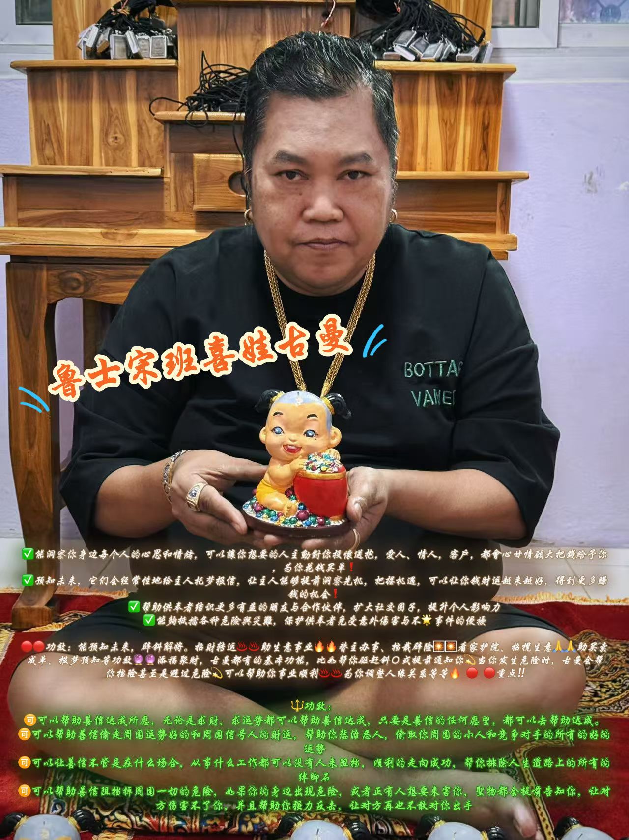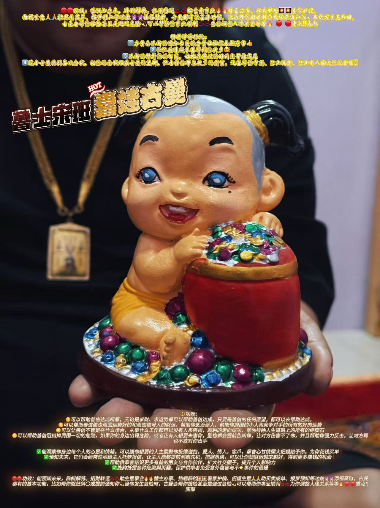 魯士宋班 喜娃古曼 🔱功效: 🉑可以幫助善信達成所願,無論是求財、求運勢都可以幫助善信達成,只要是善信的任何願望,都可以去幫助達成。 🉑可以幫助善信偷走周圍運勢好的和周圍信號人的財運,幫助你懲治惡人,偷取你周圍的小人和競爭對手的所有的好的運勢 🉑可以讓善信不管是在什麼場合,從事什麼工作都可以沒有人來阻擋,順利的走向成功,幫你排除人生道路上的所有的絆腳石 🉑可以幫助善信阻擋掉周圍一切的危險,如果你的身邊出現危險,或者正有人想要來害你,聖物都會提前告知你,讓對方傷害不了你,並且幫助你強力反擊,讓對方再也不敢對你出手 ✅能洞察你身邊每個人的心思和情緒,可以讓你想要的人主動對你投懷送抱,愛人、情人,客戶,都會心甘情願大把錢給予你,爲你花錢買單❗ ✅預知未來,它們會經常性地給主人託夢報信,讓主人能夠提前洞察先機,把握機遇,可以讓你錢財運越來越好,得到更多賺錢的機會❗ ✅幫助供奉者結識更多有益的朋友與合作伙伴,擴大社交圈子,提升個人影響力 ✅能夠抵擋各種危險與災難,保護供奉者免受意外傷害與不🌟事件的侵擾 🔴🔴功效:能預知未來,闢斜解將。招財轉運♨♨助生意事業🔥🔥替主辦事、擋栽闢險🎇🎇看家護院、招攬生意🙏🙏助買賣成單、報夢預知等功效🔮🔮添福聚財,古曼都有的基本功能,比如幫你驅趕斜〇或提前通知你💫當你發生危險時,古曼會幫你擋險甚至是避過危險💫可以幫助你事業順利♨♨爲你調整人緣關係等等🔥 🔴 🔴重點‼底部 材料詳情功效: 1⃣️力量會不斷的增加古曼的力量讓他越來越厲害👍 2⃣️讓他快速成長能幫到你更多🥰 3⃣️不斷的提升你的智慧,讓他在最短的時間內幫你成願 4⃣️這個古曼特別喜歡金錢,把你的金錢砸在古曼的底部,他會給你帶來更多的財富,還能幫你守財、防止漏財、防止有人偷走你的財富‼