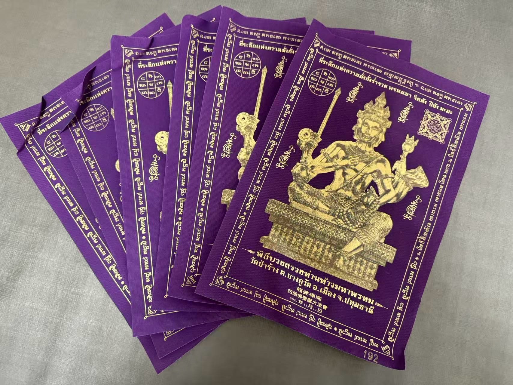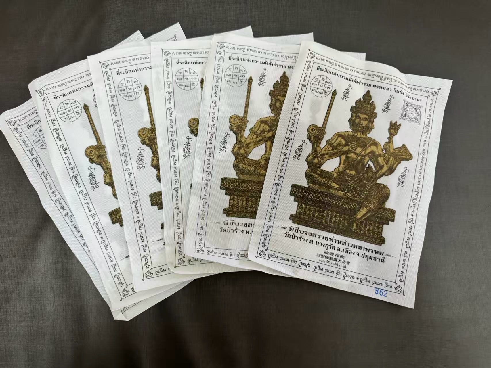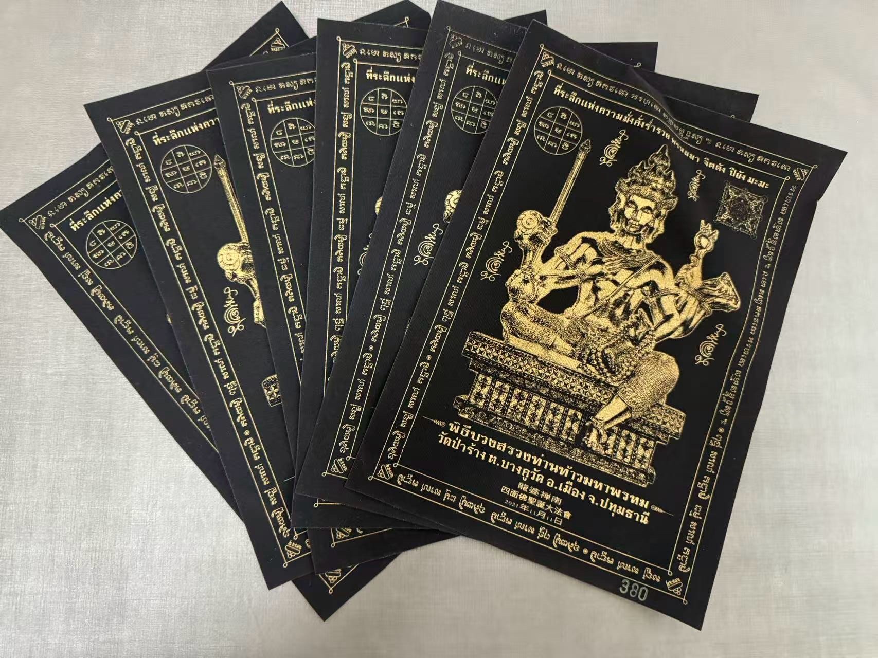 龍婆禪南法會2565年四面神符布 每個顏色只有6張 【聖物材料】纖維布質 【聖物功效】招財、助人緣、轉運、助生意事業、 愛情、家庭和睦、保平安、健康、求子等有求必應全方位。符布都閃開光神佛一樣, 而符布不佔太大空間, 非常適合辦公室或店舖。 使用方法 可以貼於家居或店舖,辦公室等。放在神枱背面作為神枱的靠背。不可對住洗手間或廚房門口位置, 此屬開光聖物, 要時刻保持有尊重的心。 可以鑲上相框以作保護。 【師傅介紹】 出生日期:佛曆2515年 出家日期:2529(14歲沙尼,2538年21歲正式為僧) 擅長法門:古法四面神法門、財運、健康、人緣 佛寺วัดบางกุฏิทอง屈班古滴通位於巴吞塔尼府這間佛寺有位龍婆禪南高僧,年紀輕輕 .近幾年的時間于泰國聲名大噪,是一位非常年輕又頗具聲望的師父 龍婆禪南高僧是居住于泰國เชื้อสายมอญ毛族人的後裔(此族原居住於緬甸一帶,後因隨著種種因素而散居各地)。龍婆禪南從小就出家為僧了,而且非常認真向每個師父學習各種法術與經典。此外他在禪定中,亦會感得龍婆拓、阿贊多、龍婆圭、龍婆速在禪定中教導他各種法術符印,因此他所製作的佛牌效力非常顯著。 龍婆禪南很尊敬龍婆托、阿贊多、龍婆圭、龍婆術和屈班古滴通的前任住持,所以他的佛寺裡有掛著這五位師父的法像。 同時他也是屈撒給寺自古製作四面佛牌法術的傳承者,因此他的寺廟每年都會舉辦四面佛牌的督造活動,而且這類活動均會吸引上千人來共襄盛舉。他的諸多信徒均表示戴了他所製作的四面佛牌後,在事業、運途等各方面都很順利。龍婆禪南高僧的靈應事蹟也因為 信徒間的口耳相傳而傳揚開來。 龍婆禪南在佛曆2515年(西元1972年)出生,他們家有三個小孩,他從小就很喜歡去佛寺參拜,因此常跟當時屈班古滴通寺的住持聊天,而與住持非常投緣。他從小就樂於向各位高僧學習法術,所以無心於學校的學業。直到佛曆2529年,他出家當了小沙彌,跟著師父到各地修行,因此學到很多精深的法術。他最後回到屈班古滴通寺,向當時的住持學習。在佛曆2538年,滿23歲時,龍婆禪南正式成為一位和尚,他開始接受更進階的修行和學習,並且會幫信徒用針刺上符印,但是後來他擔心信徒會自恃有其加持而胡作非為,所以現今已不再幫信眾刺符印。 【四面神介紹】 在亞洲有人稱之為『四面佛』,其實在泰國是稱為『四面神』,人稱『有求必應』。天神有四個面,分別代表財運、事業、愛情與健康,掌管人間的一切事務,是泰國香火最旺的佛像之一 。 四面神是神不是佛。 是婆羅門教的三大主神之一。原名大梵天王, 掌管創造萬物。四面神有四面八手,每一面代別 慈 、悲、喜 、捨。 八手有不同我法器, 每件法器代表不同的法力。 每種法器分別代表腸給眾生 : 福德 、健康 、財富、 智慧。 因為四面神具有慈、悲、喜、寫四棵梵心,所以善信無論祈求功明、事業、愛情、婚姻、富貴、利祿還是平安智慧 , 均能獲得圓滿嘅靈驗。 四面神可說是一位眼觀四方, 耳聽八面, 聞聲而應的慈悲大王。 手持得法器都代表不同的意意。 四面神能幫助佩戴者招財、招來貴人扶持、招來更多賺錢及工作機會、增加人緣、異性緣、避險、避麻煩事、小人 有很多人稱四面神為四面佛,其實是錯的。根據記載,四面神是婆羅門教的主神大梵天,所以四面神是神,不是佛。他是創造之神,代表了創造世間萬物。四面神每一面擁有不同含義,八隻手上的法器也代表不同法力。 四面神四面代表: 正面【慈】:求取學業·事業·聲望·地位等 第二面【悲】:求取愛情·婚姻·貴人等 第三面【喜】:求取錢財·富貴等 第四面【舍】:祈求身體健康·消災解難等 法器代表不同的法力意義 經書:代表聰明智慧 念珠:代表輪迴與修行 槍棍:代表驅除一切妖魔鬼怪 花瓶:代表有求必應 法螺:代表財源不絕而來 手印:代表保佑平安與幸運 法輪:代表消災解難和驅除邪魔孽障 如意寶:代表萬事如意