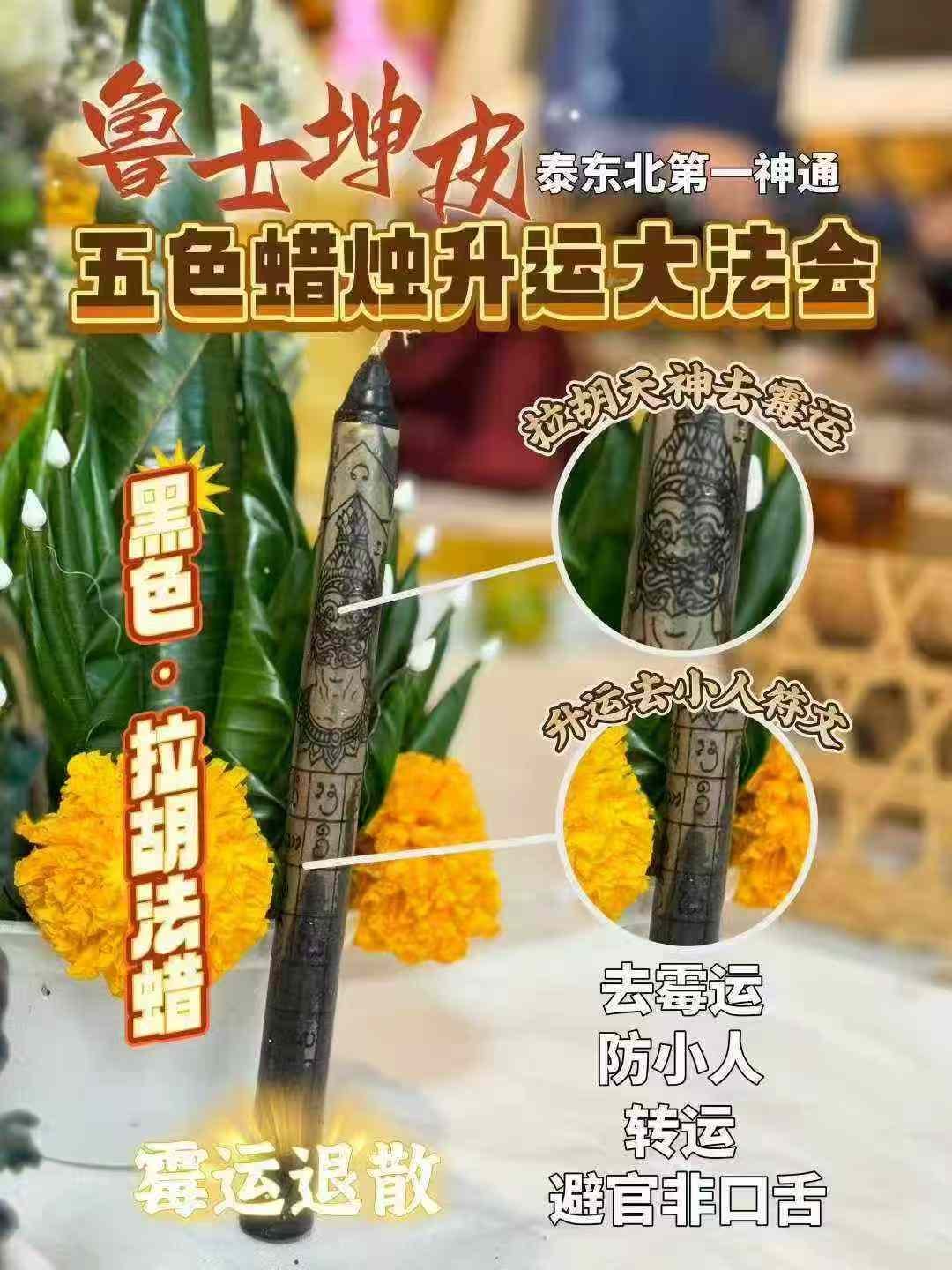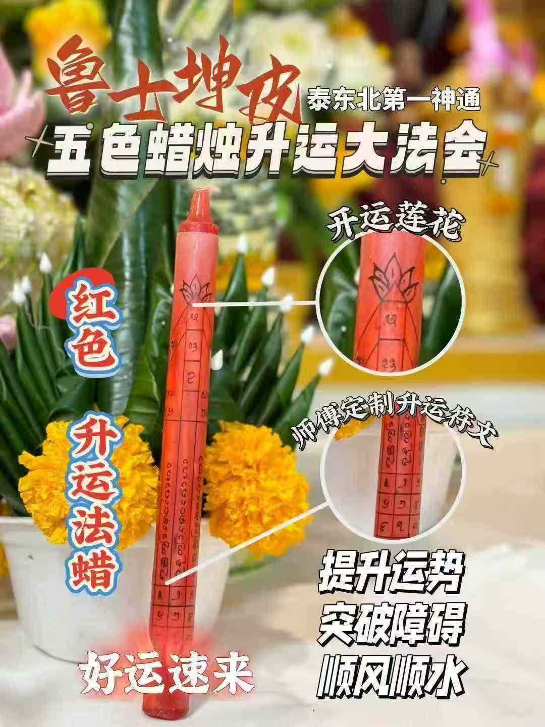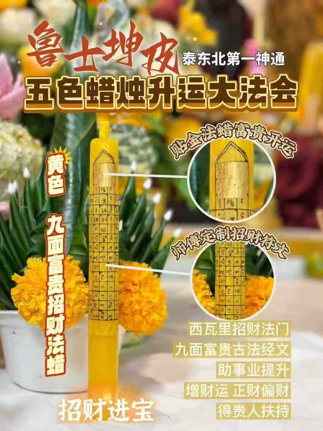 此蠟燭用料全爲平時師傅法壇拜師用的黃色大蜡燭燃盡收集而制,燭身貼有魯士坤皮師傅掌握的九種招財法門經文符紙,點燃前需再次摸上法油,同樣需要9⃣位師傅共同唸經祈福點燃。