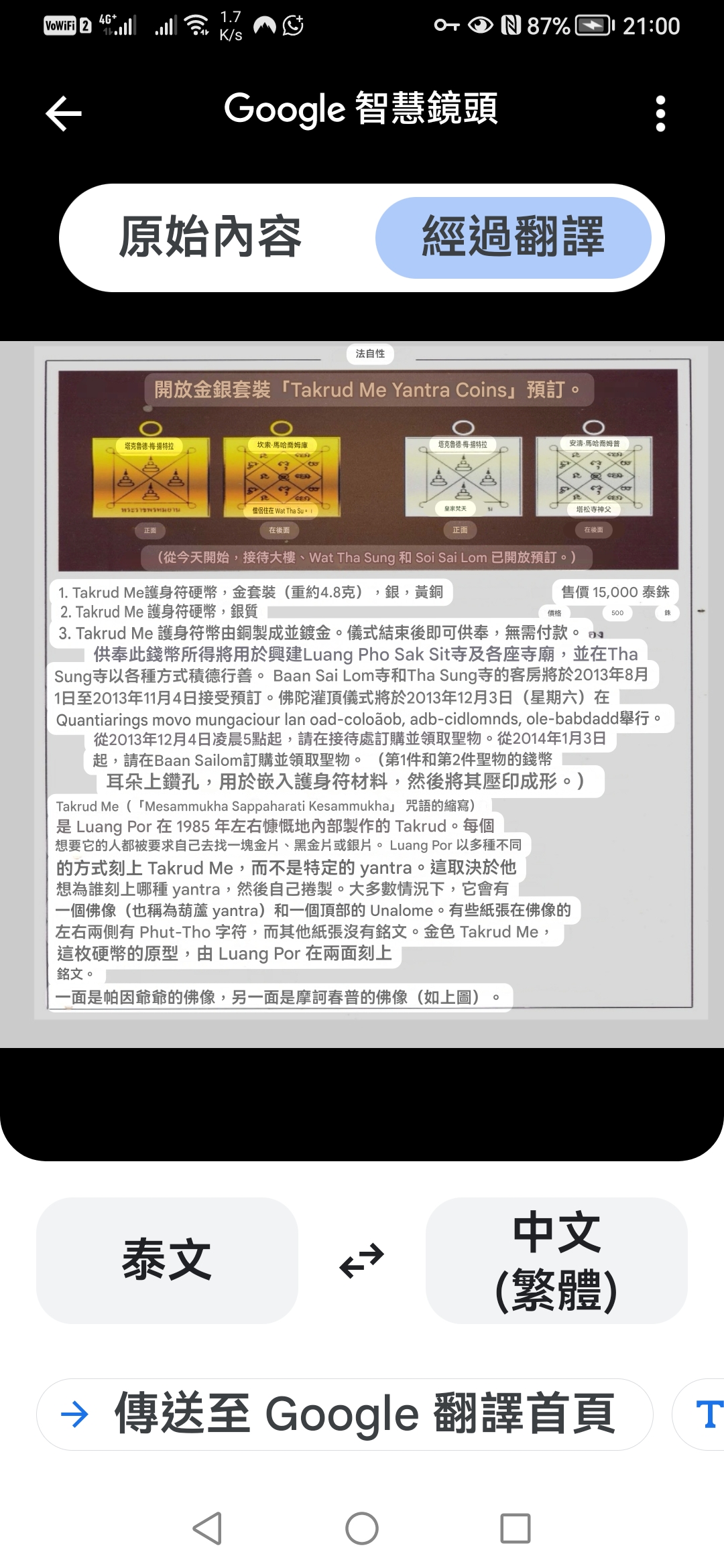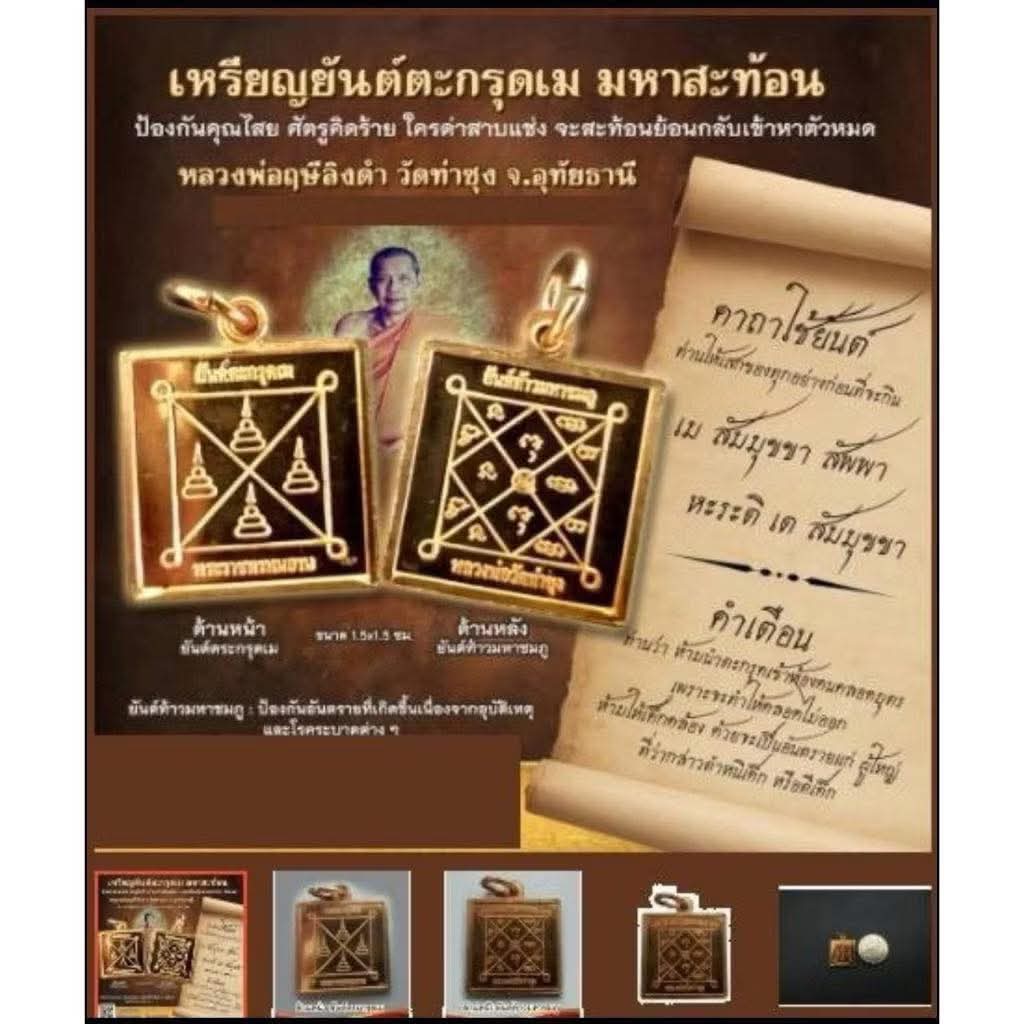 Takrut Me Maha Sathon – 龍婆魯士靈丹之「百倍反彈」重現世間 緣起背景 「Takrut Me」又稱 「Maha Sathon」——即「萬象反射」符管,源自 Luang Pho Rue Si Ling Dam 之密傳,主打反彈回擊、正邪分明的法門,於佛歷 2556 年 12 月 7 日星期六加持的儀式(Sao Ha)由現任住持 Luang Pho Anan 加持。 大雄寶殿內舉行,法力隆盛,靈驗非凡。 符管之靈:核心咒語 "Me Sammukhkha Sappa Harati Te Sammukhkha" 此咒一旦練成,乃有「萬法反照、諸惡自焚」之效,甚至能反彈子彈回擊射出之人! 法力功效總結 反彈傷害:一切對你所加的惡意、攻擊、詛咒,皆百倍千倍反彈。 防小人陷害:適合商業、仕途、競爭領域人士穿戴。 護體正氣:諸邪不侵,防妖防咒,清除無形幹擾。 慎用與禁忌 不得讓兒童佩戴。 因法力極強,孩童無法控制反彈力道,一旦行為失當,反傷自身或家人。 不可攜帶進入人或動物分娩場所,會阻礙生產,遭業力反制。 製作說明 這枚「Takrut Me」可謂是 反彈法門的巔峰之作。 對修持者而言,是一把“正義的迴力刀”,你行正道,它護你安康;若有人惡意加害,它必令對方自食惡果。 若您正遭遇不明詭異之事、職場小人、是非重重、家宅不寧,此符乃最佳法器!
